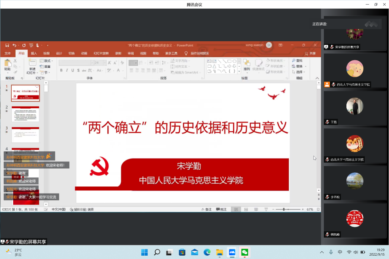 9月15日晚,宋学勤应邀做客乐鱼网页版页面登录“侯外庐学术讲座”第239讲,为师生作了题为“‘两个确立’的历史依据与历史意义”的精彩报告。报告由马克思主义学院王强教授主持,马克思主义学院党委中心组成员和学院师生、部分院系2021级本科生在“习近平新时代中国特色社会主义思想概论”课堂上在线参加了本次报告会。