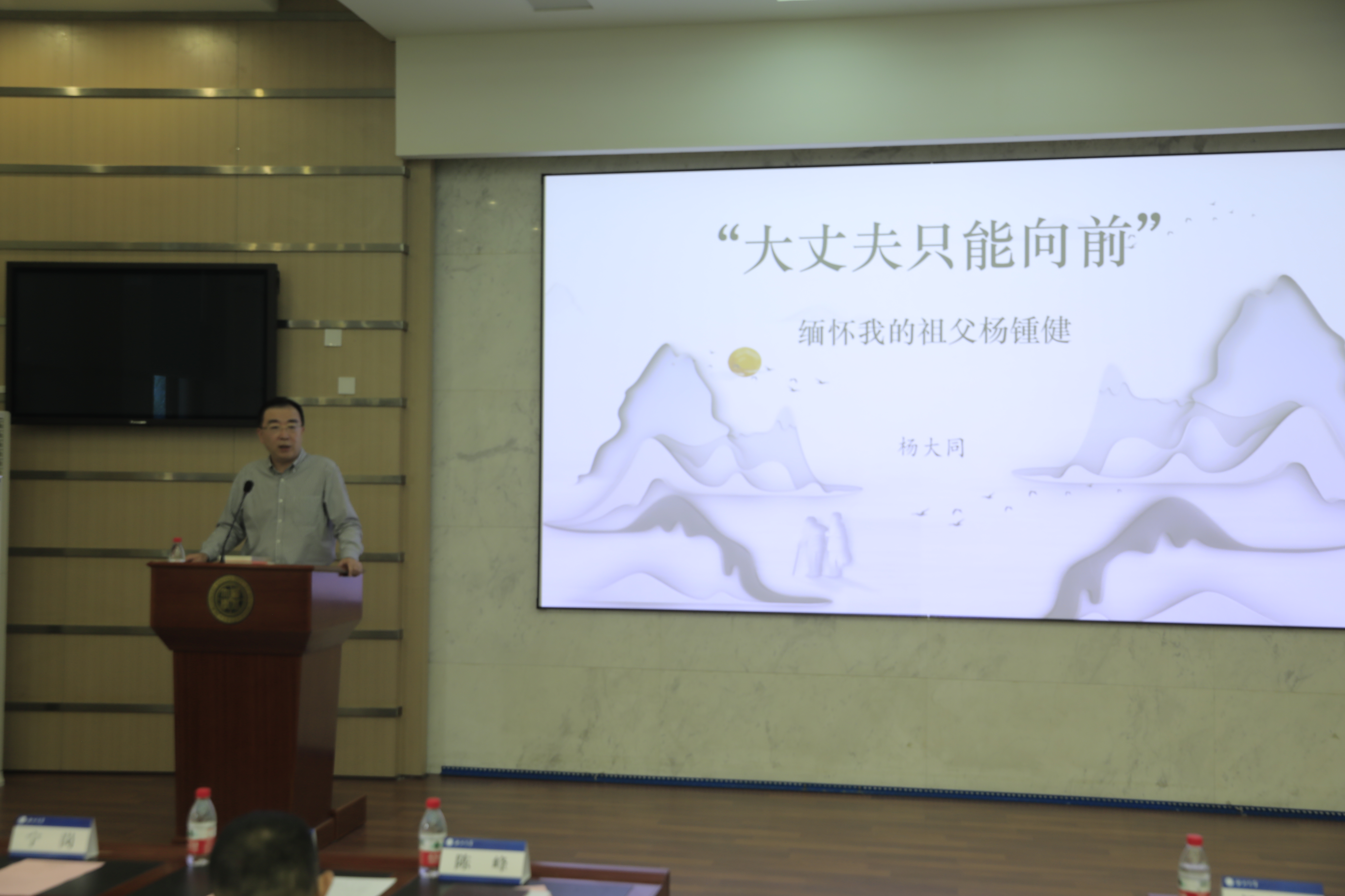 仪式上,杨钟健家属向学校捐赠了书籍《杨钟健回忆录》《杨钟健文集》《杨钟健诗词选》《中国古脊椎动物学的奠基人纪念文集》《杨钟健游记(三卷七部)》《杨钟健院士年谱及纪念图集》和影片《杨钟健》。学校向杨钟健家属颁发了捐赠证书及纪念品。杨大同先生为师生作了题为“大丈夫只能向前”的专题报告。