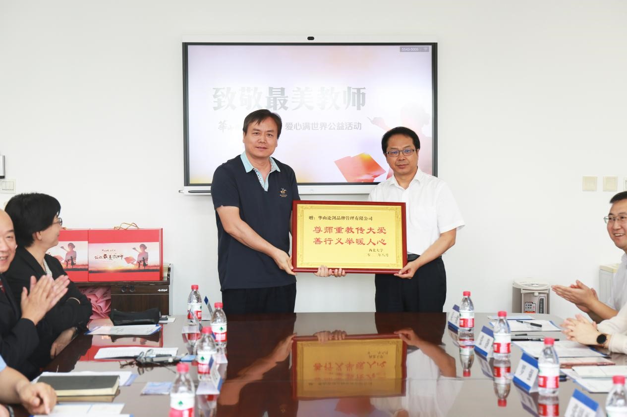 张周平向学校捐赠物资,常江,国内合作与校友工作处负责人、外国语学院行政负责人代表学校接受捐赠。校工会负责人代表学校向华山论剑品牌管理有限公司赠发牌匾。