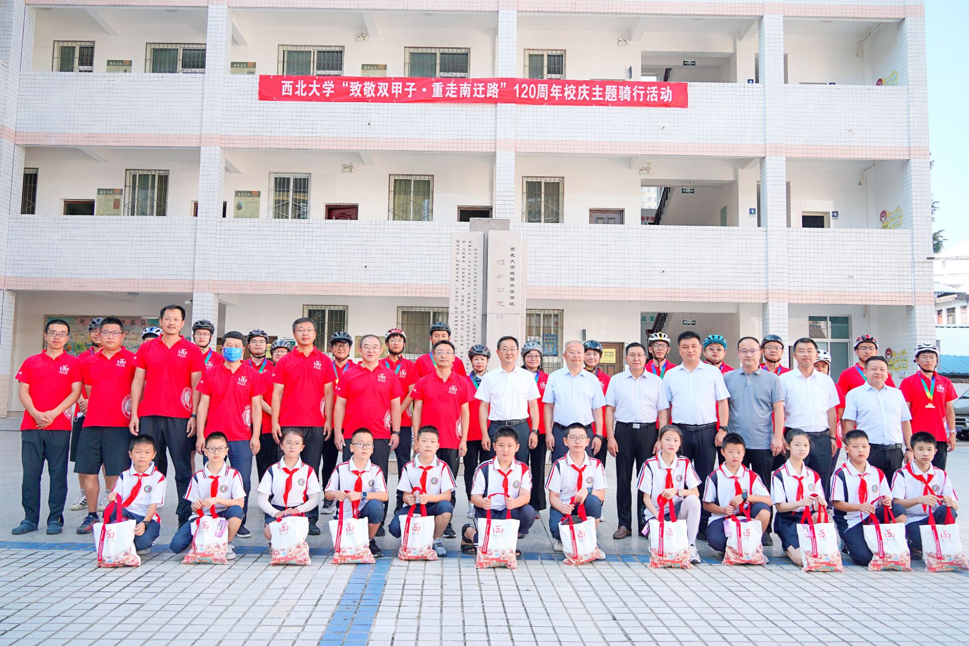 仪式上,骑行队员还为考院实验小学学生代表赠送了文体用品和纪念品。仪式结束后,骑行队员们集体参观了西北联大法商学院旧址。