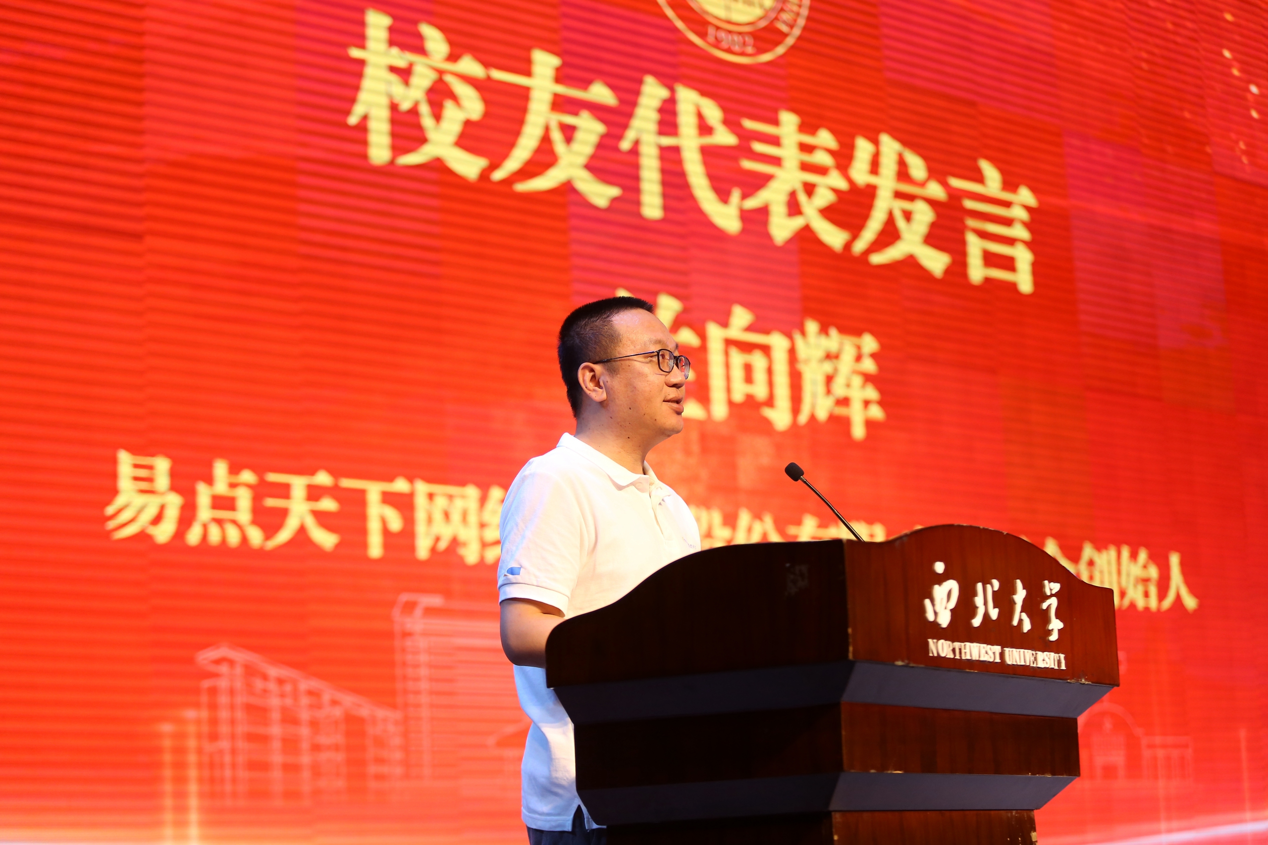 易点天下网络科技股份有限公司联合创始人兰向辉代表全体校友在典礼上发言。他结合自身创业和工作经历,通过回顾曾经在校学习时光,对学弟学妹们提出了“坚持终身学习的个人习惯,坚守不诚无物的道德信念、勤则不匮的优秀品质、抱朴守真的价值追求”的期望。