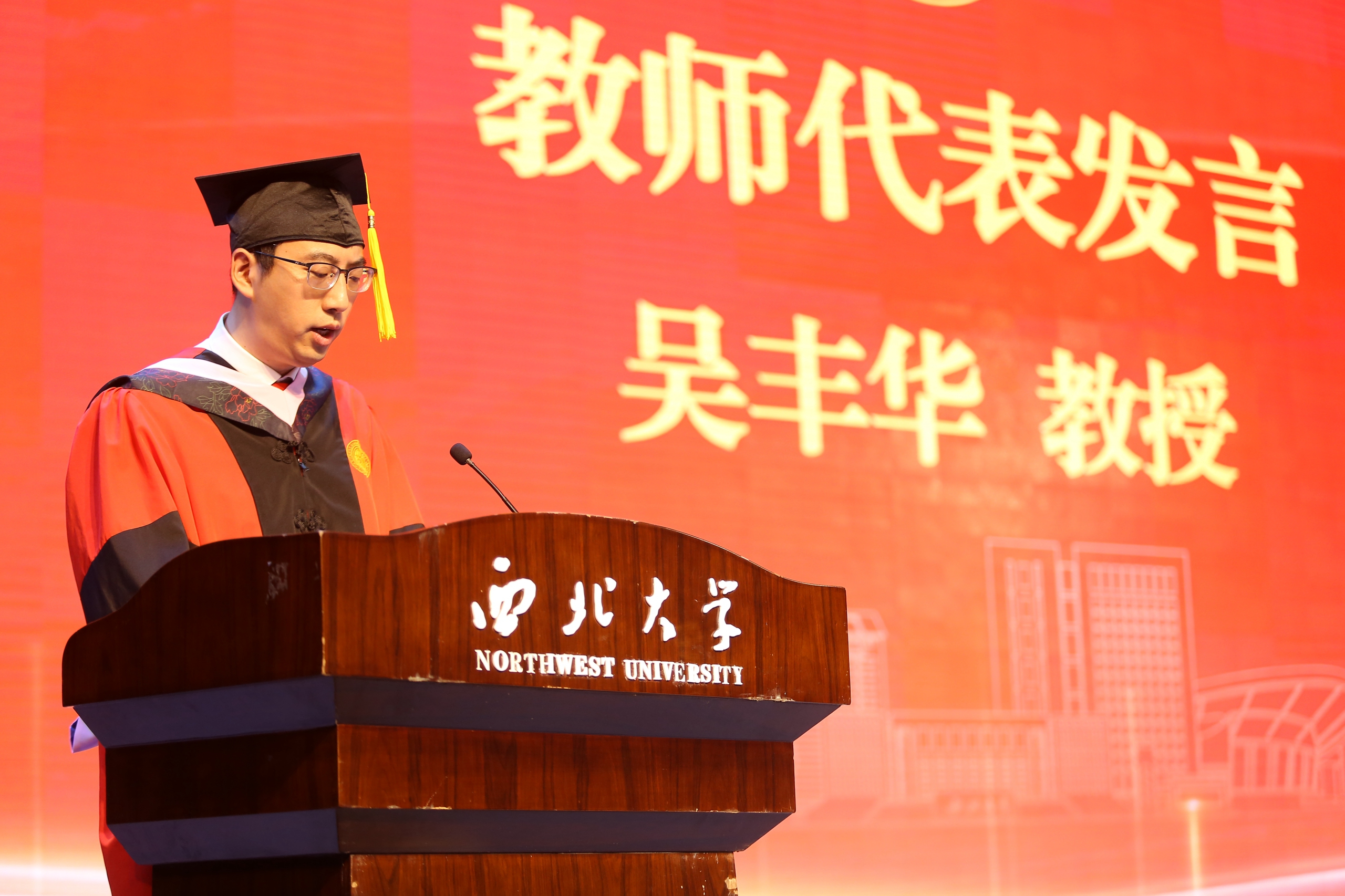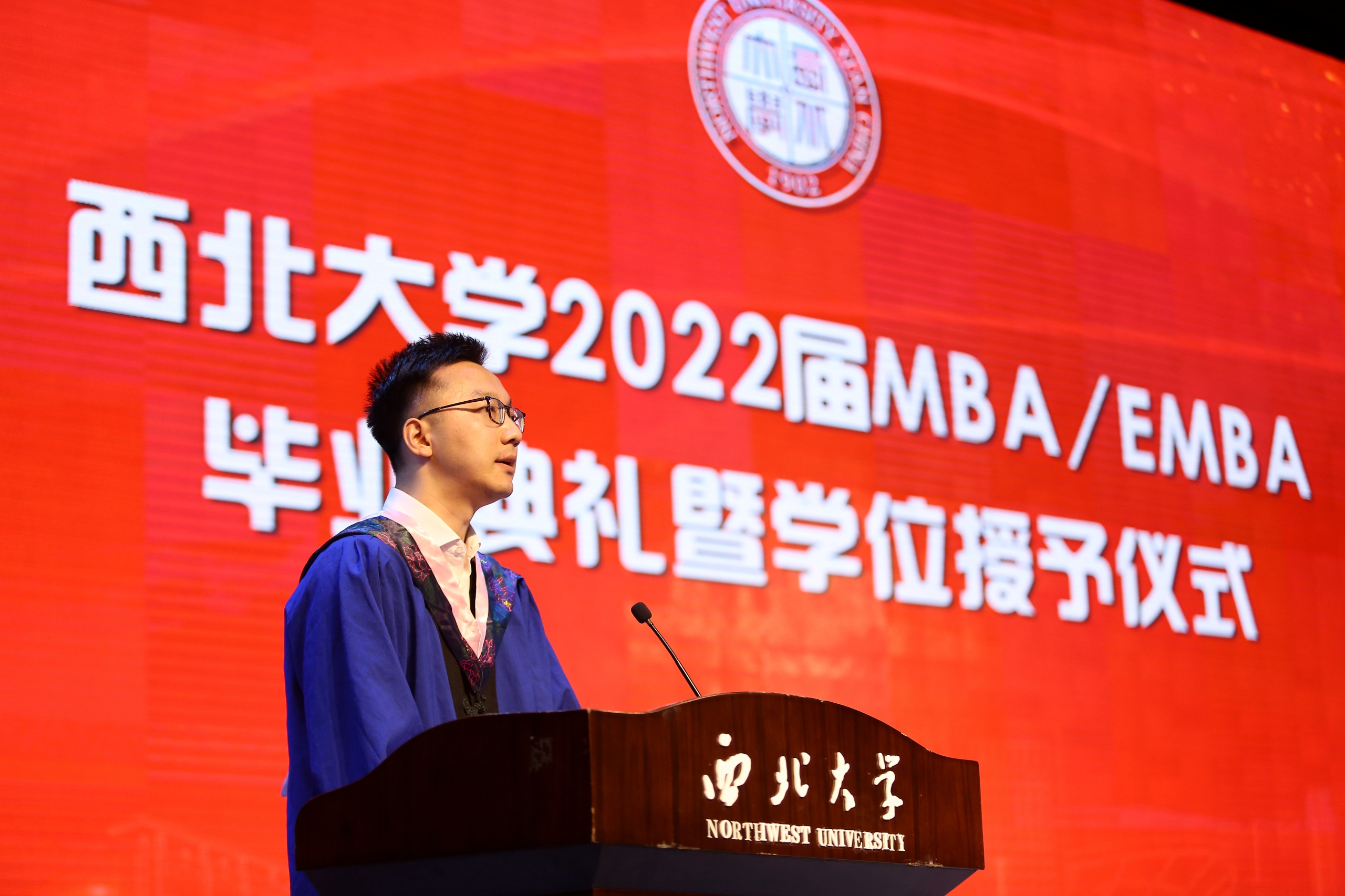 西安曲江文化产业投资有限公司企业管理部部长许启宁代表毕业生发言。他结合在校期间学习经历、切身感受和自身收获,表达了对母校的感谢和与母校即将分离的不舍。