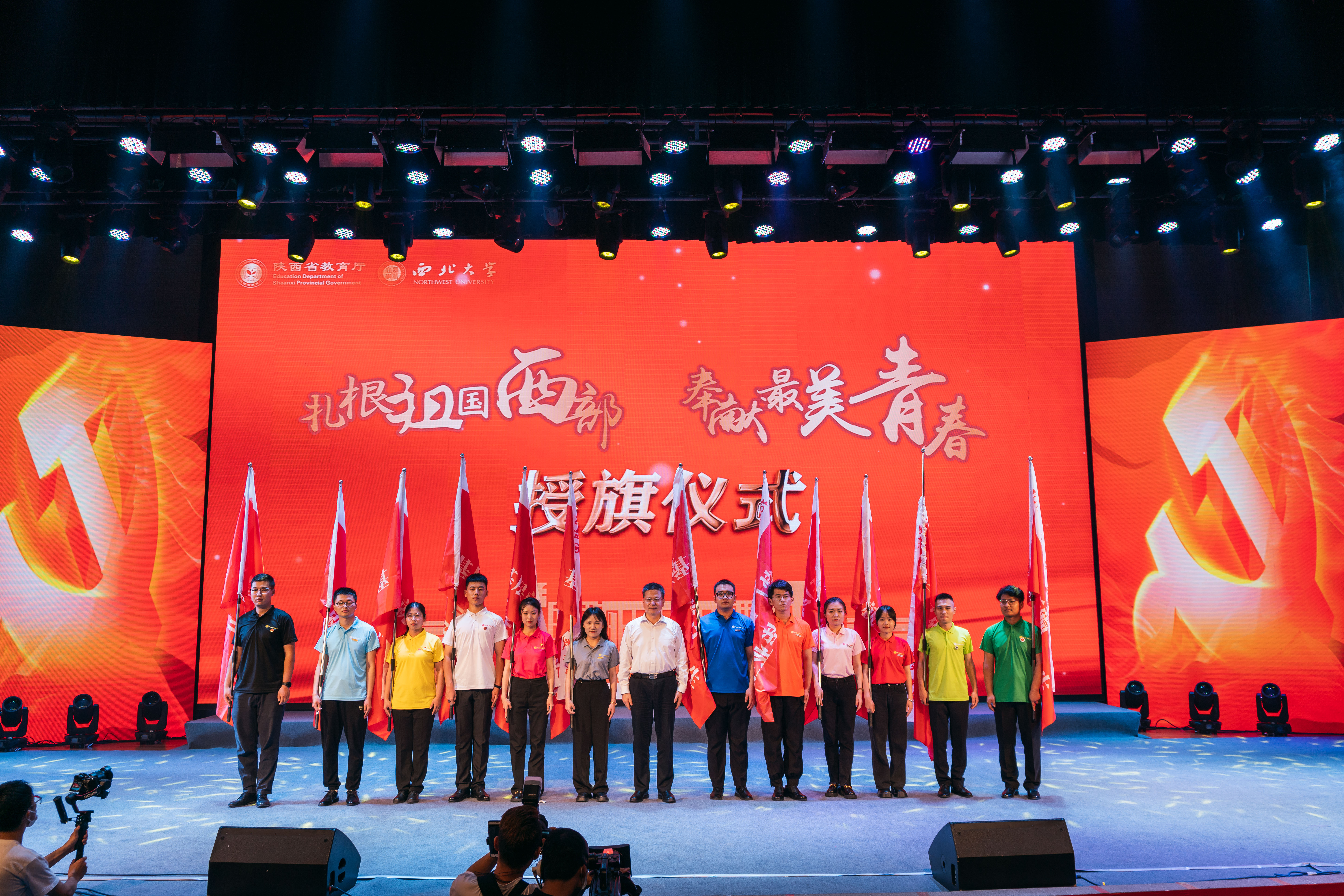 仪式现场方光华为2022年到西部基层就业的毕业生代表授旗。张军林、高岭为陕西省优秀毕业生代表颁奖,余洪生、朱征南为陕西省优秀学生干部代表颁奖。