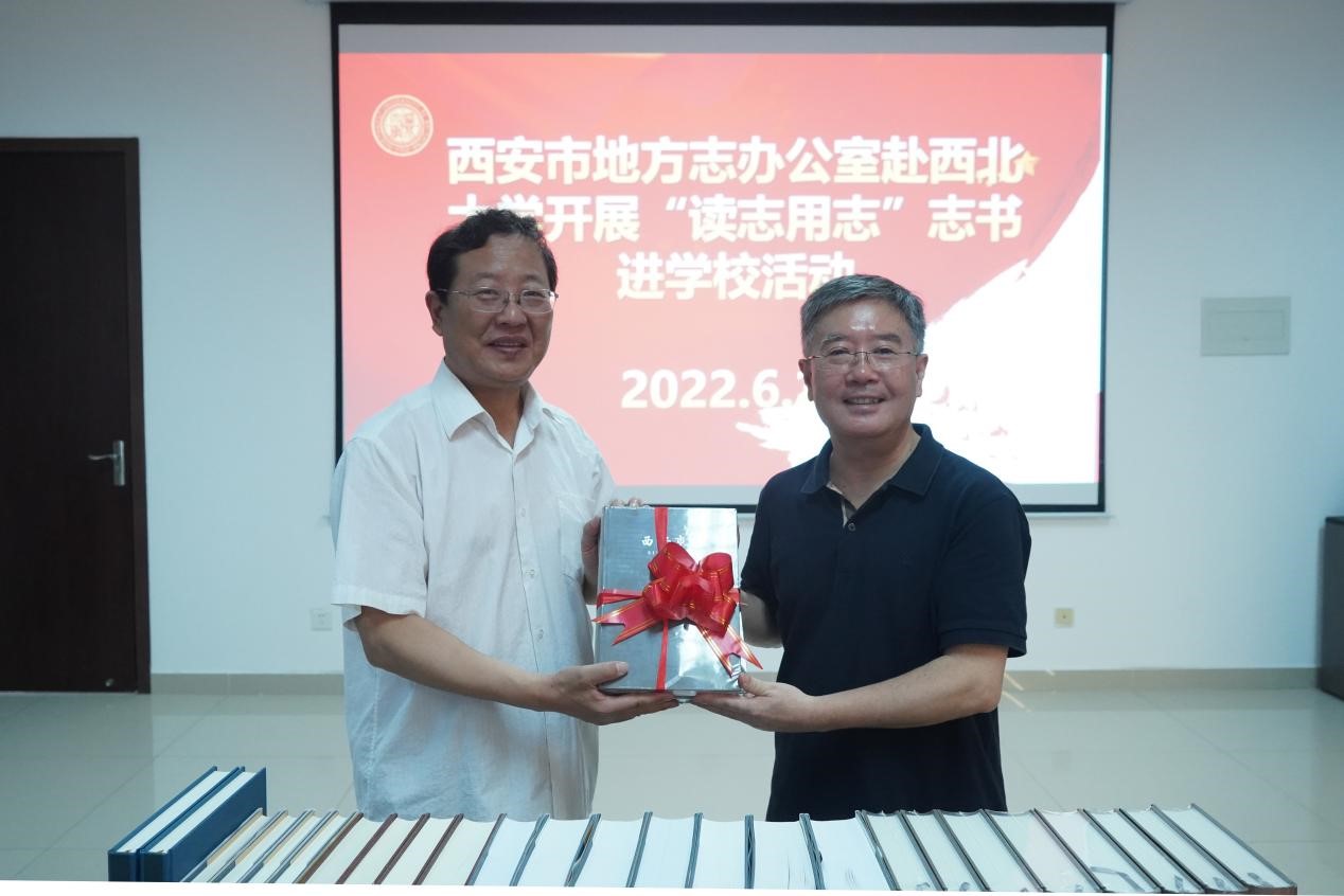 姚敏杰代表西安市地方志办公室向学校捐赠志鉴、地情书籍共计62本,郭立宏代表学校接受赠书并向西安市地方志办公室颁发收藏证书。