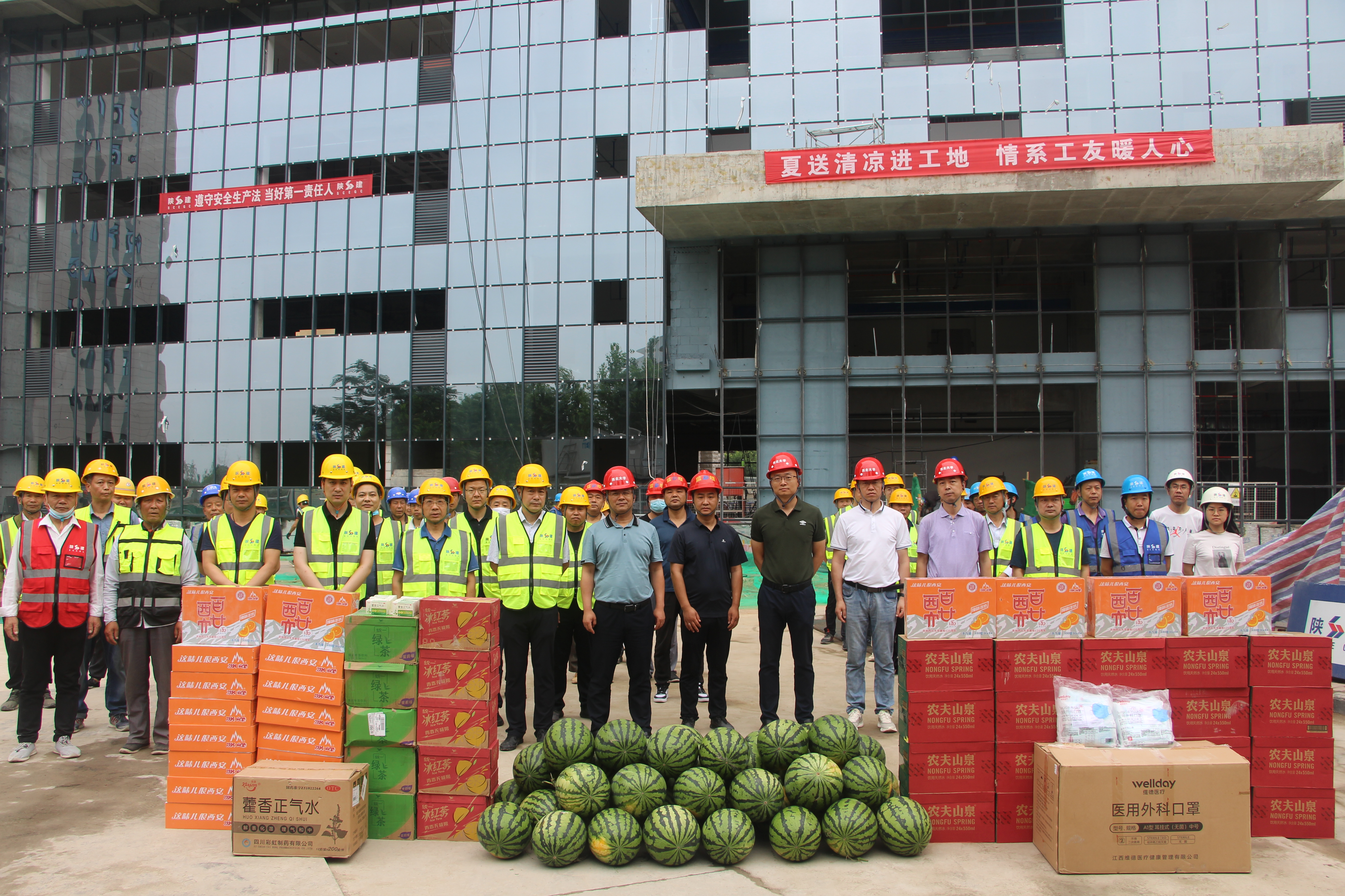 6月10日,学校组织开展在建项目工地“夏送清凉进工地,情系工友暖人心”慰问活动。校党委常委、副校长奚家米,深入能源化工大楼、宏观经济大楼施工现场,给坚守在工作岗位上的工友们送去西瓜、绿茶、冰峰、矿泉水、藿香正气水、口罩等防暑降温和防疫物品,代表学校向辛勤劳作的一线工人师傅们表示慰问。基建处相关负责人陪同。