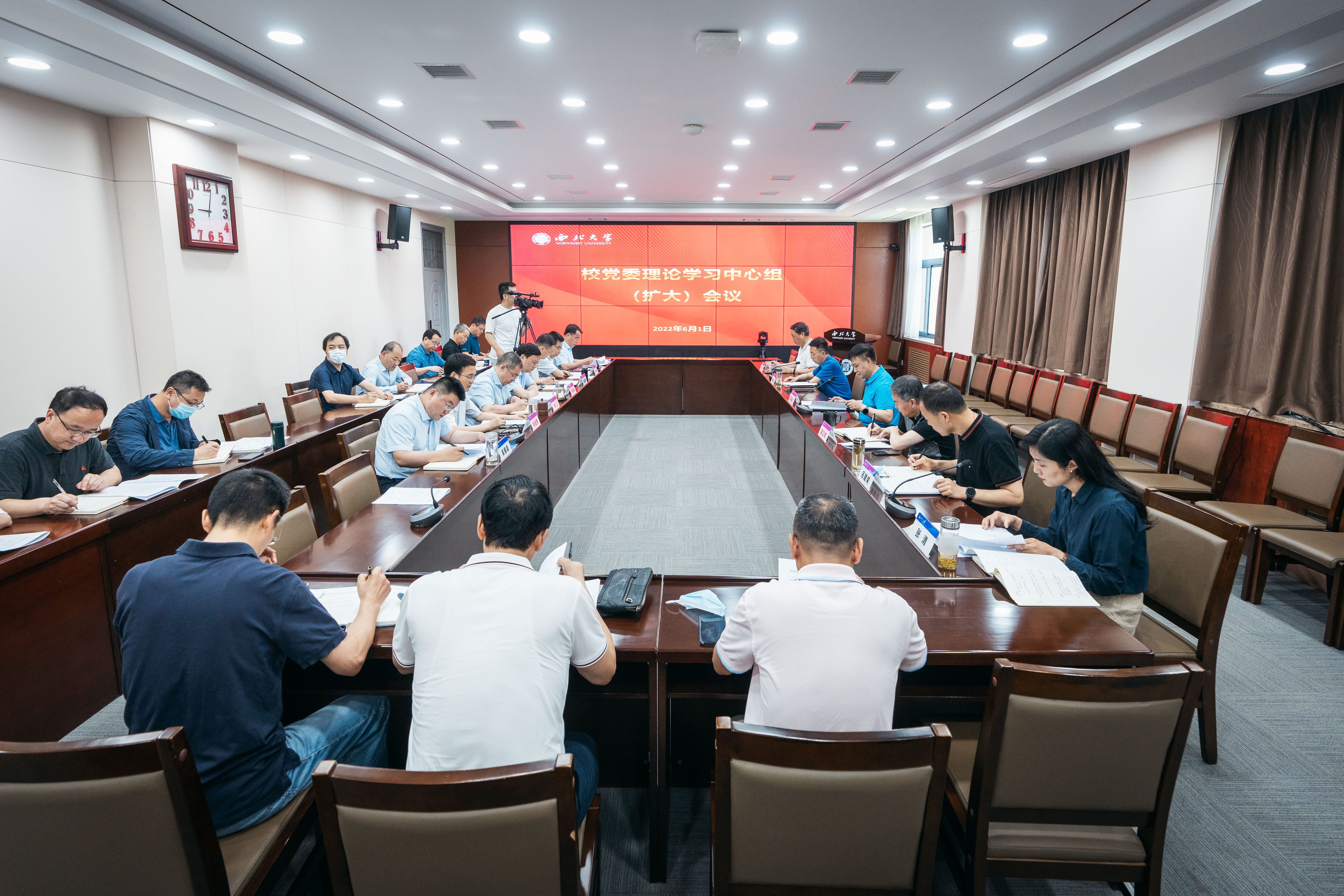 6月1日上午,校党委理论学习中心组在长安校区召开扩大学习会议,集中学习研讨习近平总书记最新重要讲话重要回信精神、陕西省第十四次党代会精神和相关重要学习内容。校党委理论学习中心组成员,文学院、文化遗产学院、哲学学院、新闻传播学院院长参加了会议。会议由校党委书记王亚杰主持。