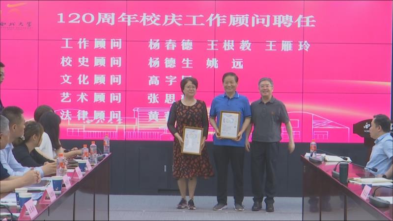 为汇集众智众力,全力做好120周年校庆工作,学校决定聘请杨春德、王根教、王雁玲为工作顾问,杨德生、姚远为校史顾问,高字民为文化顾问,张思望为艺术顾问,黄菁茹为法律顾问。郭立宏向校庆顾问颁发聘书。受聘顾问分别发言,表示要把对学校的热爱转化为推动校庆工作的力量,充分发挥经验优势、专业优势为校庆贡献智慧和力量。