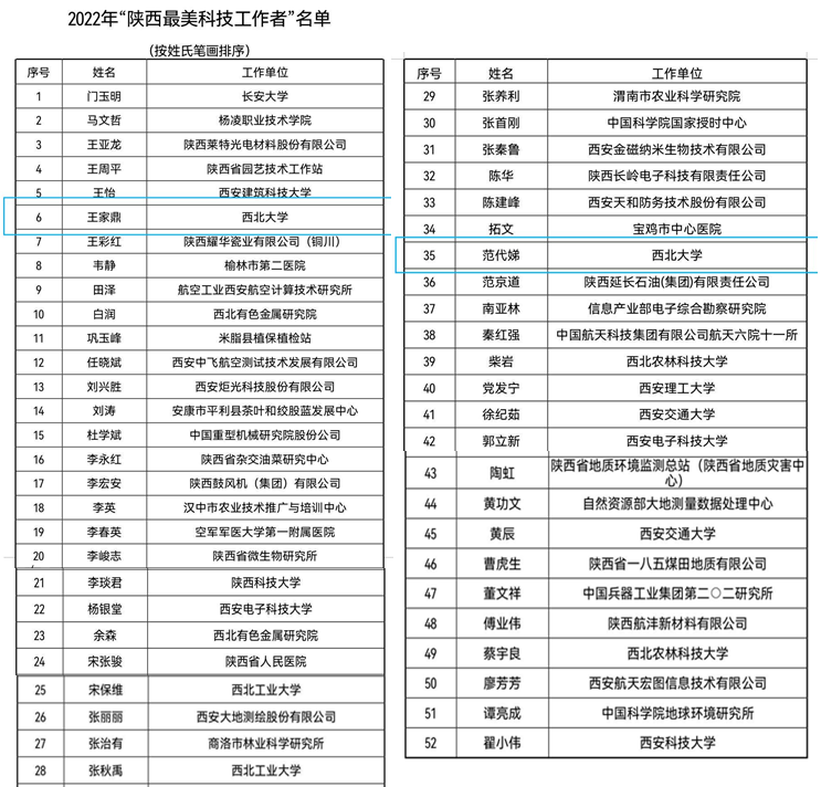 为加强对广大科技工作者的思想政治引领,弘扬“科学家精神”和“西迁精神”,进一步增强广大科技工作者获得感、归属感、荣誉感,激发科技工作者创新争先热情,省委组织部、省委宣传部、省科技厅、省科协共同组织开展了2022年“寻找陕西最美科技工作者”活动。通过层层推荐选拔,经活动组委会审议,共有52名长期扎根陕西,服务基层一线,成绩突出的优秀科技工作者荣获2022年 “陕西最美科技工作者”称号。