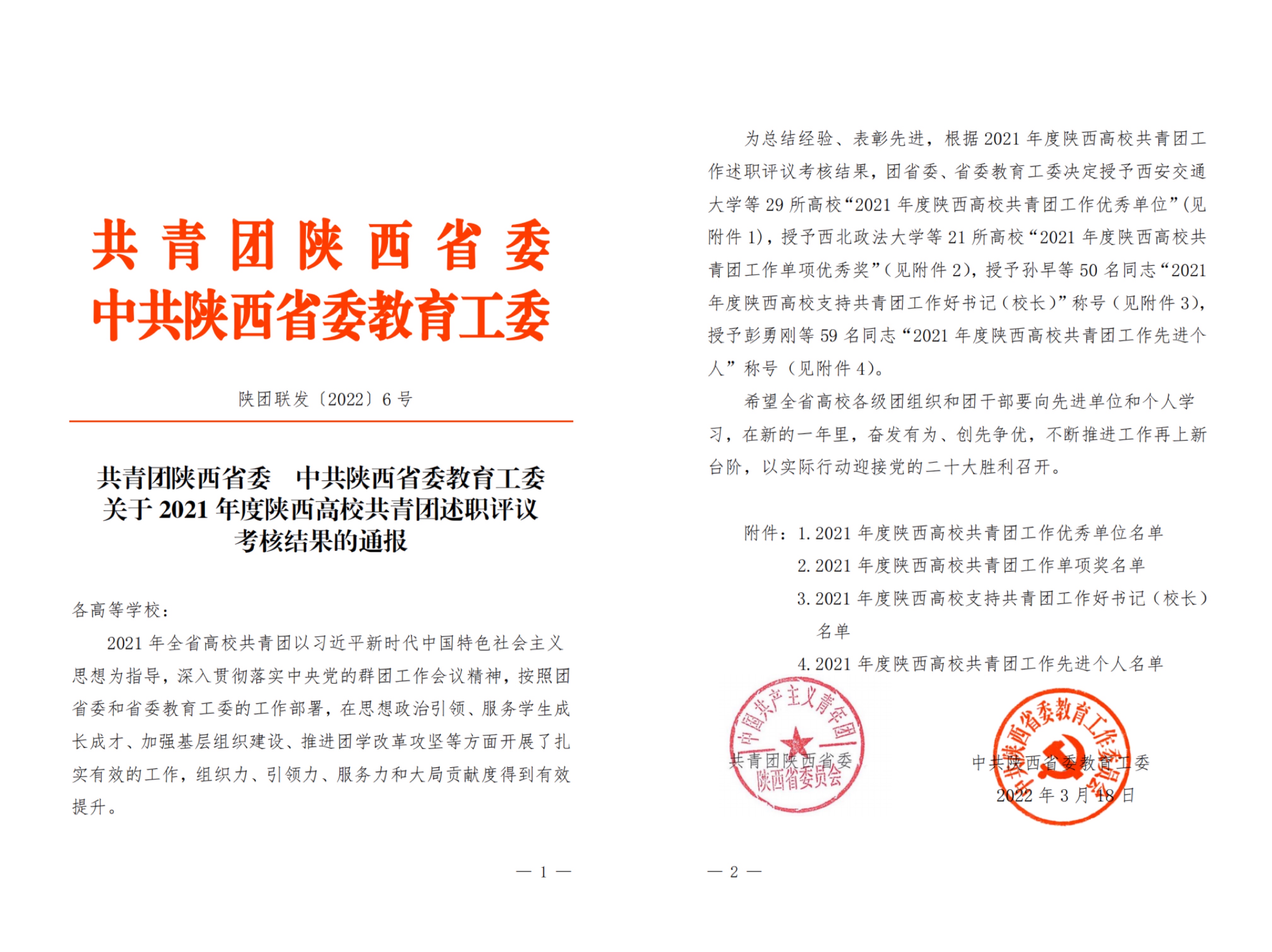 近日,共青团陕西省委、中共陕西省委教育工委发布的《关于2021年度陕西高校共青团述职评议考核结果的通报》,乐鱼网页版页面登录获2021年度“陕西高校共青团工作优秀单位”,乐鱼网页版页面登录党委副书记吕建荣获2021年度“陕西高校支持共青团工作好书记(校长)”,校团委邹阳笛获2021年度“陕西高校共青团工作先进个人”。