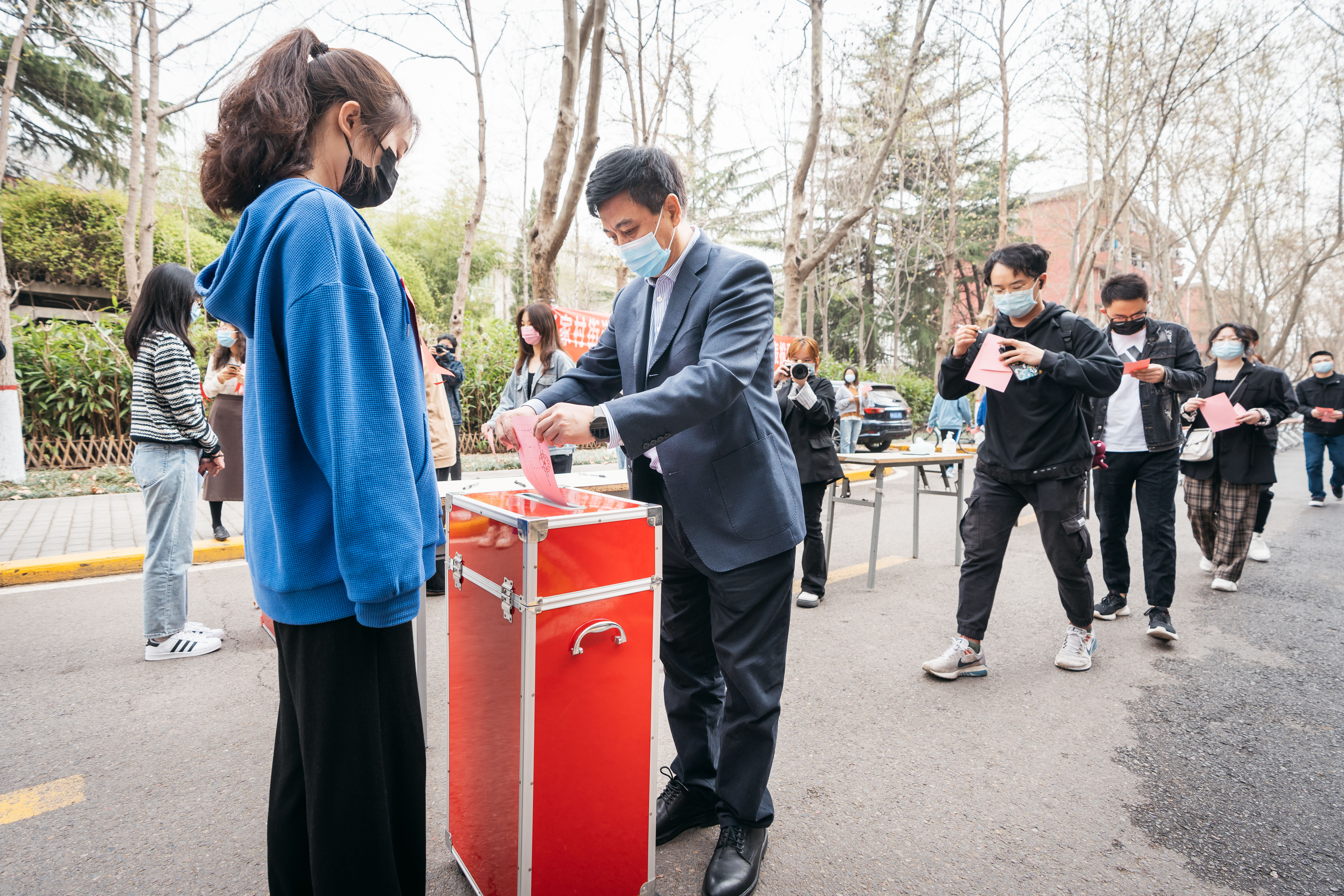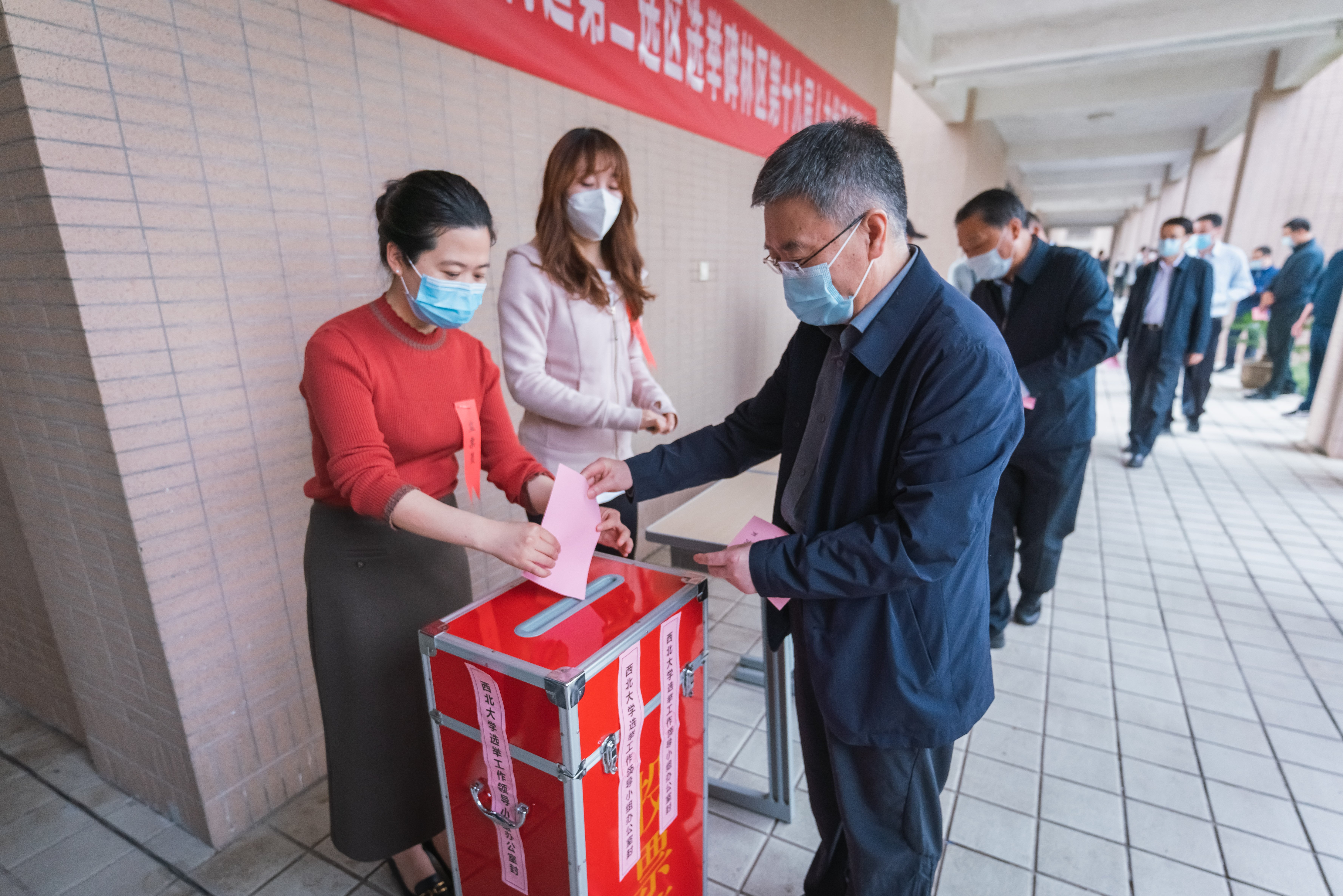 本次选举主会场太白校区大礼堂设1个固定票箱,为方便选民投票,学校在太白、长安、桃园在三校区另设37个投票站。投票选举严格执行疫情防控要求,在主会场和各投票站入口处逐一检查口罩佩戴情况,实行“亮码+测温”通行管理,5个集中计票点严格落实同一时段不超过50人的管控要求。为了加强对各投票站投票组织工作的监督指导,学校在主会场设置了网络投屏,滚动播放各投票站实时视频画面,确保选举工作规范公正。