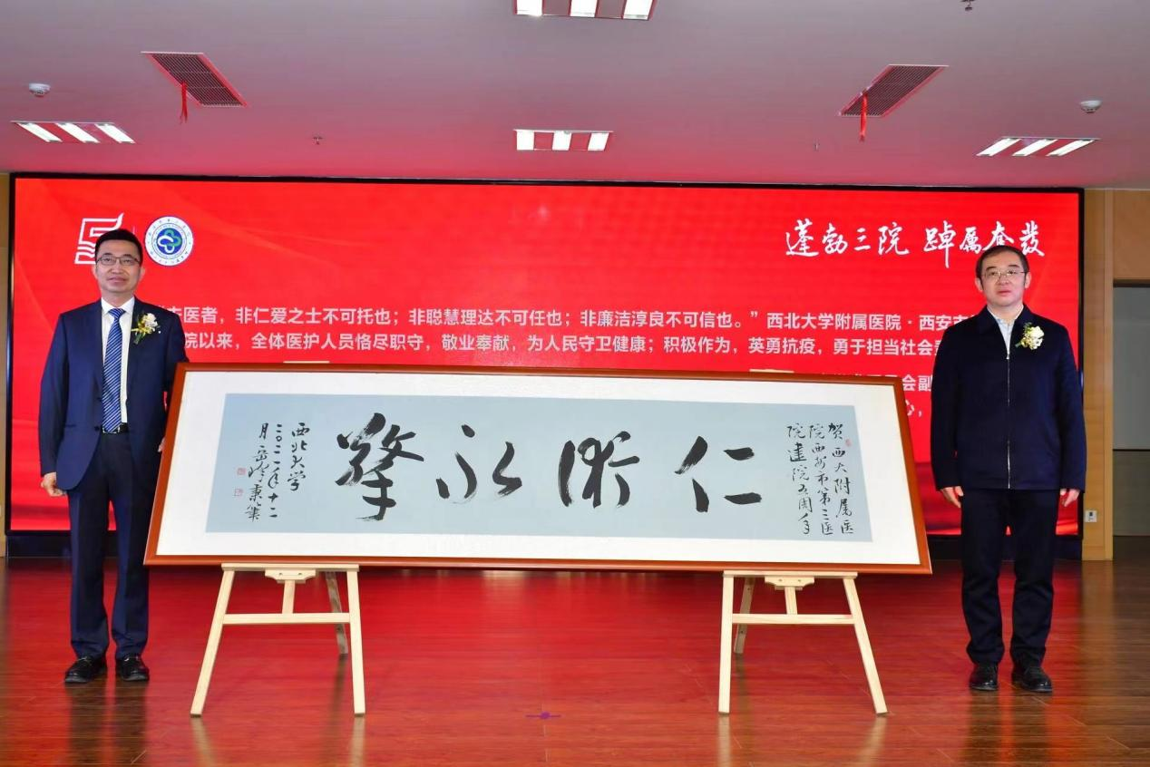 常江代表学校参加了医院二期建筑主体封顶仪式,并在院庆大会上赠送了题有“仁术永擎”的书法大卷作为贺礼,砥砺医院全体同仁铭记初心,厚德怀仁,祝愿医院蓬勃发展,为增进人民健康福祉作出新贡献。陈富林在致辞中表示,校院合作以来双方通过深度融合共建,取得了丰硕的成果,成为医教研合作的成功典范。他期望通过学校和医院的不断融合、创新发展,为“教育强市”和“健康西安”建设贡献更多的西大智慧和西大力量,推动医院加快建成具有国际影响力、国内竞争力、区域带动力的高水平区域医疗中心。