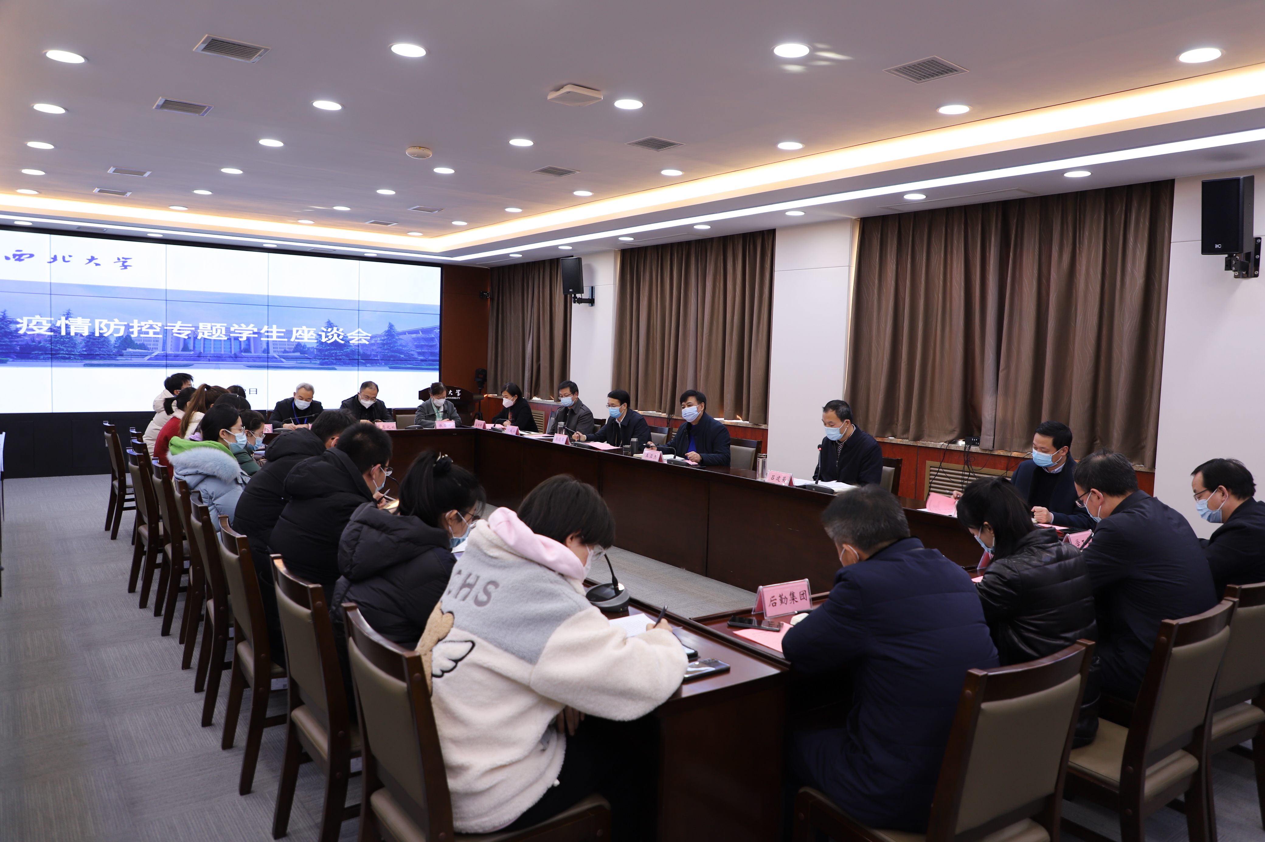 1月12日下午,学校疫情防控专题学生座谈会在长安校区召开。校党委书记王亚杰,校党委常委、副校长张远军、陈富林,党(校)办、宣传部、学工部、研工部、校团委、教务处、保卫处、信息化处、后勤集团及校医院负责人,学生代表及部分学工干部参加了座谈会。座谈会由校党委副书记吕建荣主持。