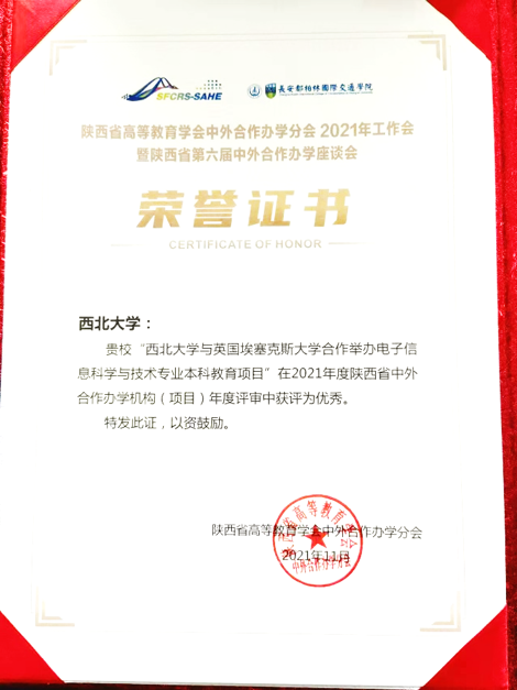 日前,由陕西省教育厅主办、陕西省高等教育学会合作办学分会和长安大学承办的陕西省高等教育学会中外合作办学分会2021年工作会暨陕西省第六届中外合作办学座谈会在长安大学召开。开幕式上宣布并表彰了省内10个优秀中外合作办学机构(项目),乐鱼网页版页面登录与英国埃塞克斯大学合作举办的电子信息科学与技术专业本科教育项目获评2021年度陕西省中外合作办学优秀项目,校党委常委、副校长赖绍聪代表学校上台领奖。