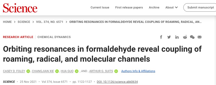 近日,乐鱼网页版页面登录物理所谢长建教授与美国新墨西哥大学理论化学家Hua Guo教授和美国密苏里大学实验科学家Arthur G. Suits教授课题组,针对甲醛单分子光解动力学,理论与实验研究结合,阐释了实验上最新观测到的甲醛光解离共振现象,带来了对“漫游”反应机理的微观量子特征的新认识。研究成果以“Orbiting Resonances in Formaldehyde Reveal Coupling of Roaming, Radical and Molecular Channels”为题在Science上发表(Science 374, 1122 (2021),Research article)。
