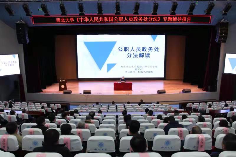 12月2日,学校在长安校区举办《中华人民共和国公职人员政务处分法》专题辅导报告会,邀请西北政法大学博士生导师褚宸舸教授主讲。校党委副书记赵作纽,校党委常委、副校长常江、赖绍聪、张远军,全校副处级以上领导干部,无行政级别实体机构负责人参加了报告会。报告会由校党委副书记、纪委书记、省监委驻校监察专员李邦邦主持。