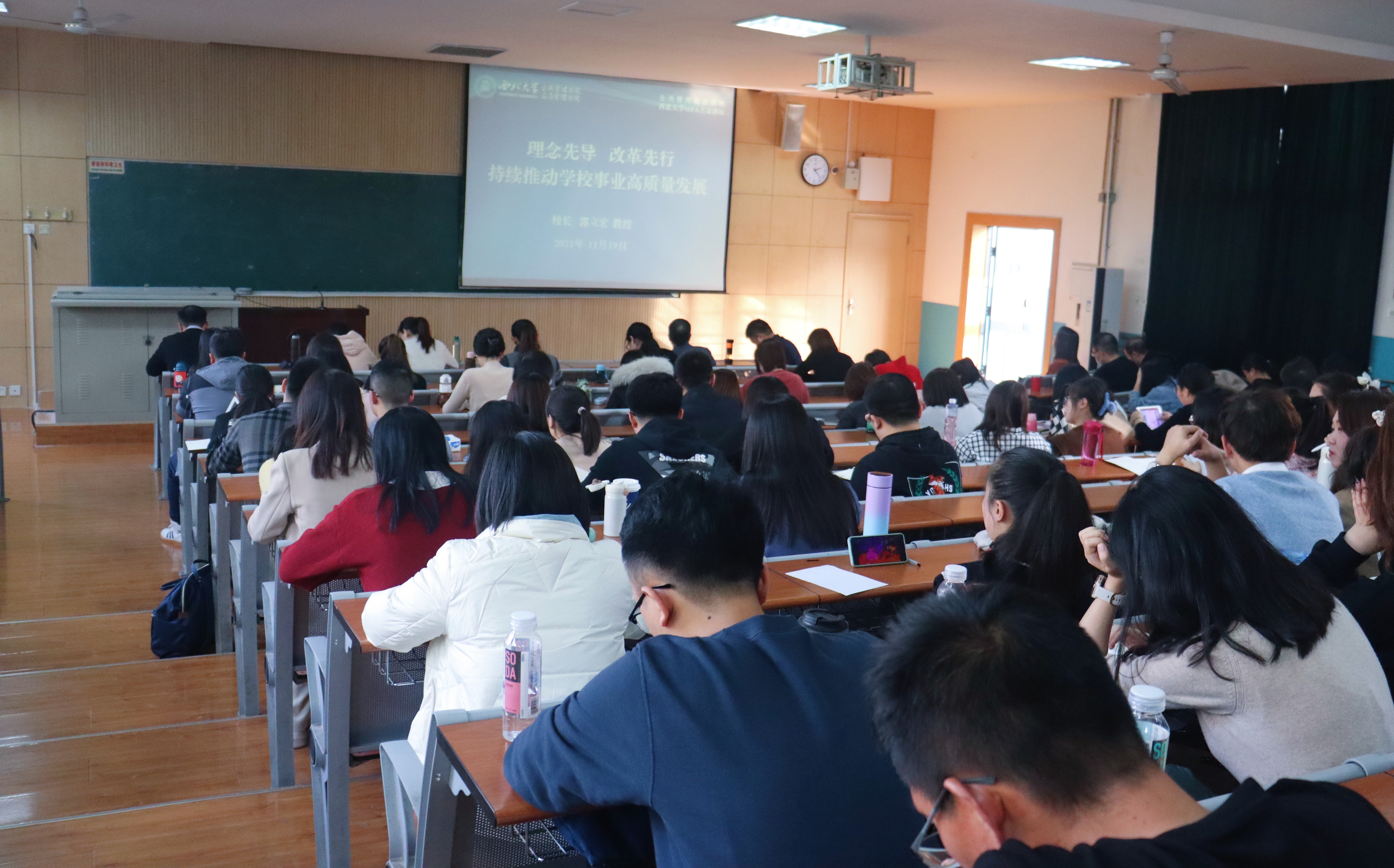 11月19日下午,乐鱼网页版页面登录在太白校区举行公共管理前沿讲座暨乐鱼网页版页面登录MPA名家讲坛。校长郭立宏受邀为公共管理学院2021级MPA研究生作了“理念引领 改革先行 持续推动学校事业高质量发展”的专题报告,公共管理学院部分教师及MPA学生160余人参加了报告会,报告由公共管理学院雷晓康教授主持。