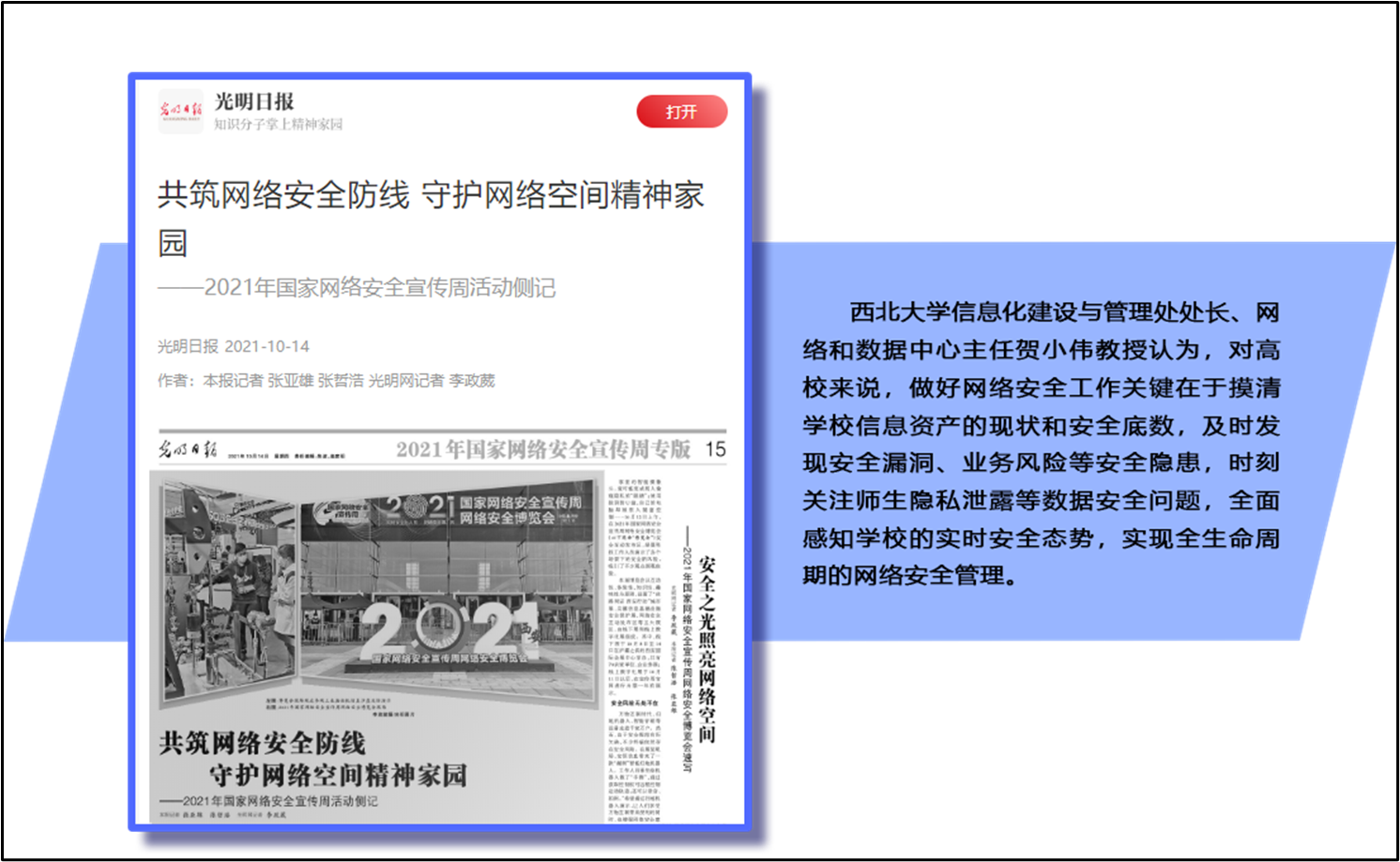 在光明日报10月14日刊发的《共筑网络安全防线 守护网络空间精神家园》文章中,引用了乐鱼网页版页面登录贺小伟教授对高校网络安全工作的理解和观点:“对学校来说,做好网络安全工作关键在于摸清学校信息资产的现状和安全底数,及时发现安全漏洞、业务风险等安全隐患,时刻关注师生隐私泄露等数据安全问题,全面感知学校的实时安全态势,实现全生命周期的网络安全管理。”