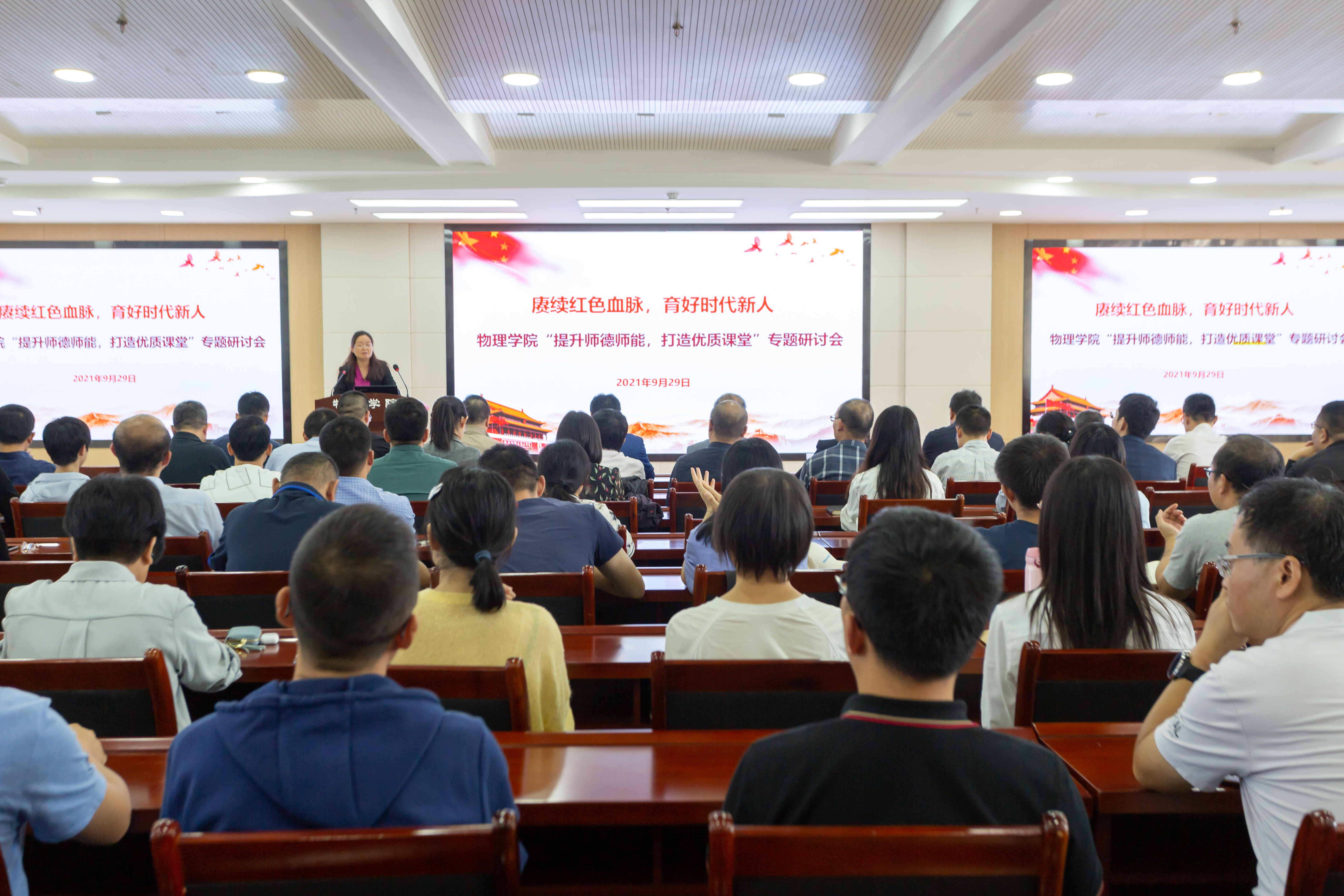 为深入贯彻习近平总书记重要讲话和批示精神,进一步推进党史学习教育走深走实,强化师德师风建设,提高教育教学水平,9月29日下午,物理学院党委以“赓续红色血脉 育好时代新人”为主题,围绕学校“课程质量年”建设要求,举办“提升师德师能 打造优质课堂”专题研讨会。校党委常委、副校长赖绍聪,纪检监察综合室、教工部、研工部、教务处等相关负责人,物理学科全体教职工参加了本次大会。大会由物理学院党委负责人主持。