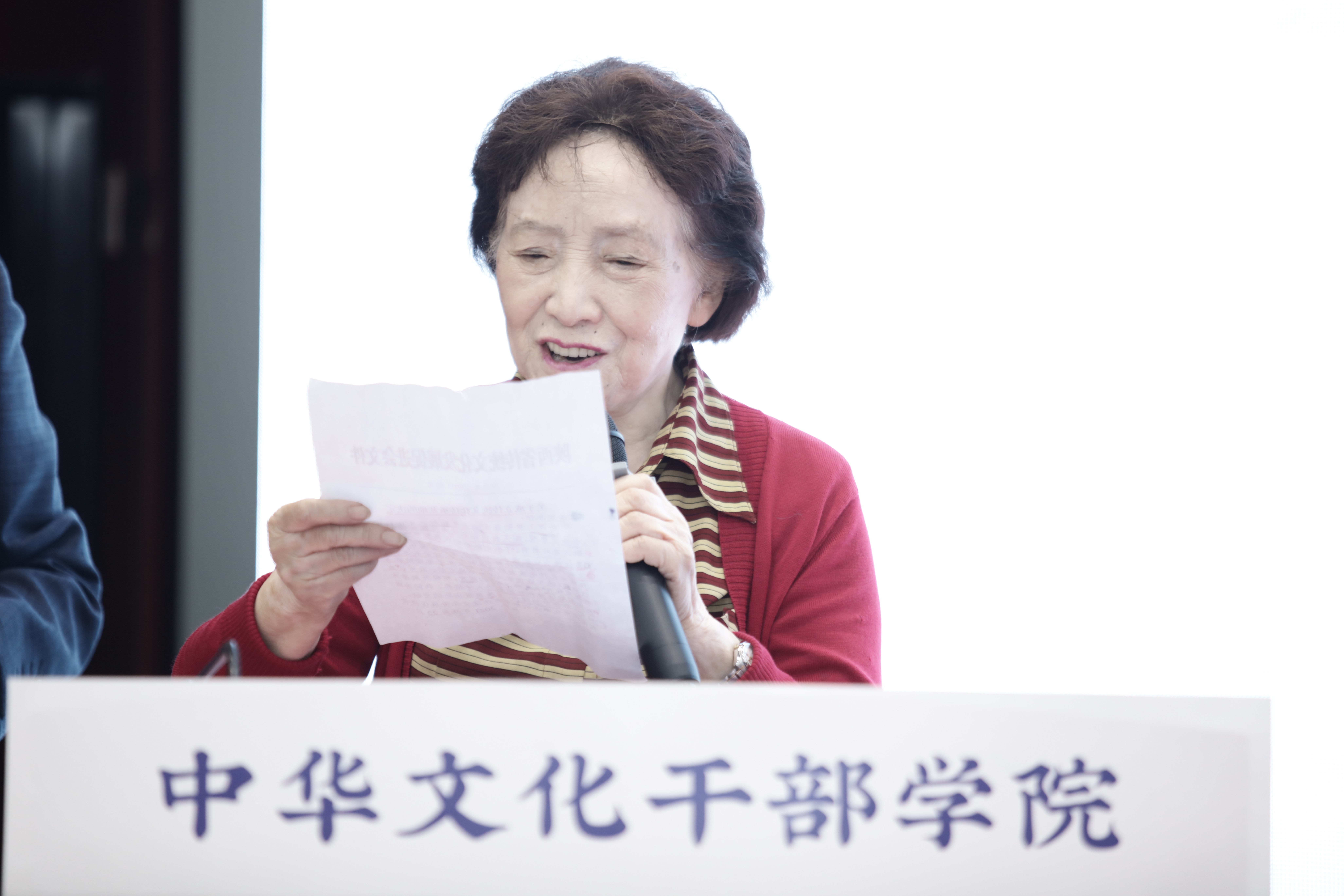 著名女高音歌唱家、国家一级演员、全国"五一"劳动奖章获得者、“时代楷模”、陕西省传统文化发展促进会终身名誉监事长贠恩凤宣读“关于成立传统文化传承基地”的决定文件