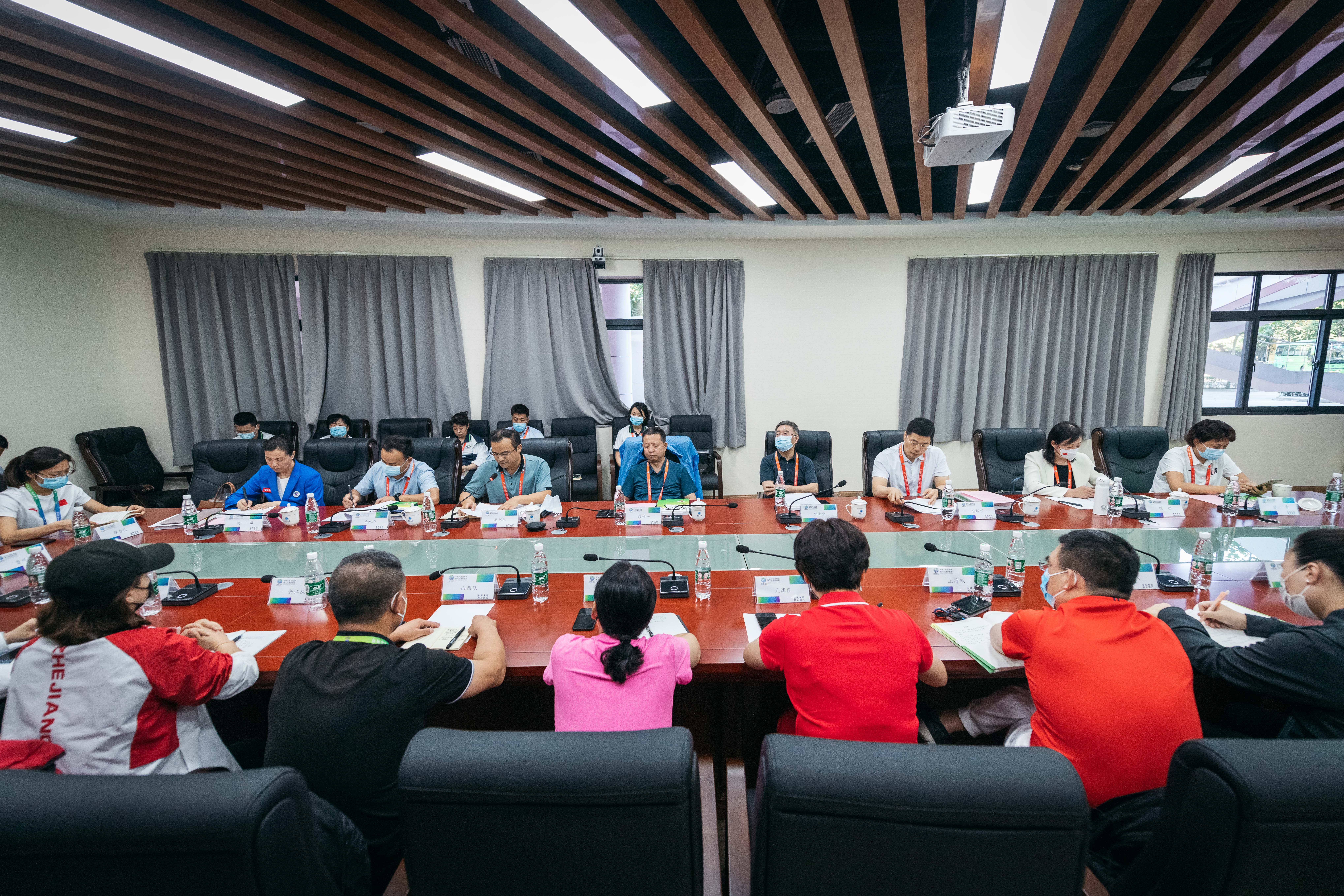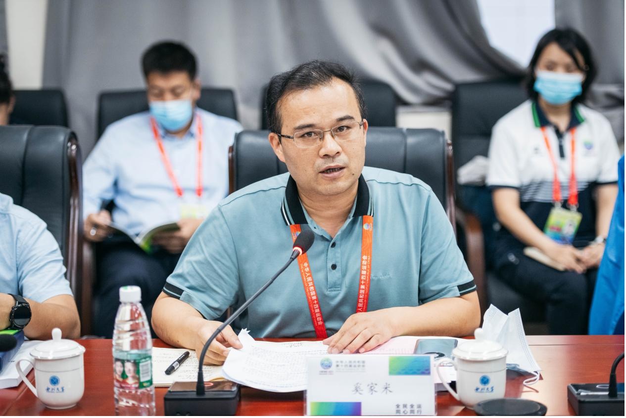 奚家米介绍了竞赛场馆基本情况和赛事筹备情况,指出竞委会把疫情防控和竞赛组织放到同等重要位置,严格落实疫情防控要求,精心筹备赛事组织。他介绍9月6日蹦床比赛结束后,工作团队连夜加班,对比赛器材、背景图标、流线标识等进行了更换布展,高标准完成场地转换任务,目前,场地器材、安全保卫、志愿服务等各项赛事筹备工作已全部到位,赛事保障条块畅达、执行有力。