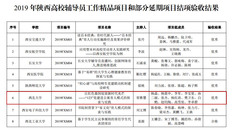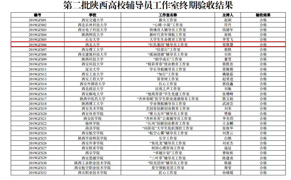 近日,省委教育工委下发《中共陕西省委教育工委关于公布第二批陕西高校辅导员工作室终期验收结果和2019 年陕西高校辅导员工作精品项目结项验收结果的通知》,乐鱼网页版页面登录“红色基因”辅导员工作室顺利通过验收,被授予“陕西高校省级辅导员示范工作室”,生命科学学院常雅慧荣获“陕西高校名优辅导员”称号,精品项目《让红色基因绽放新时代光芒——“123”党建进公寓育人模式的探索与实践》被评为优秀验收成果。