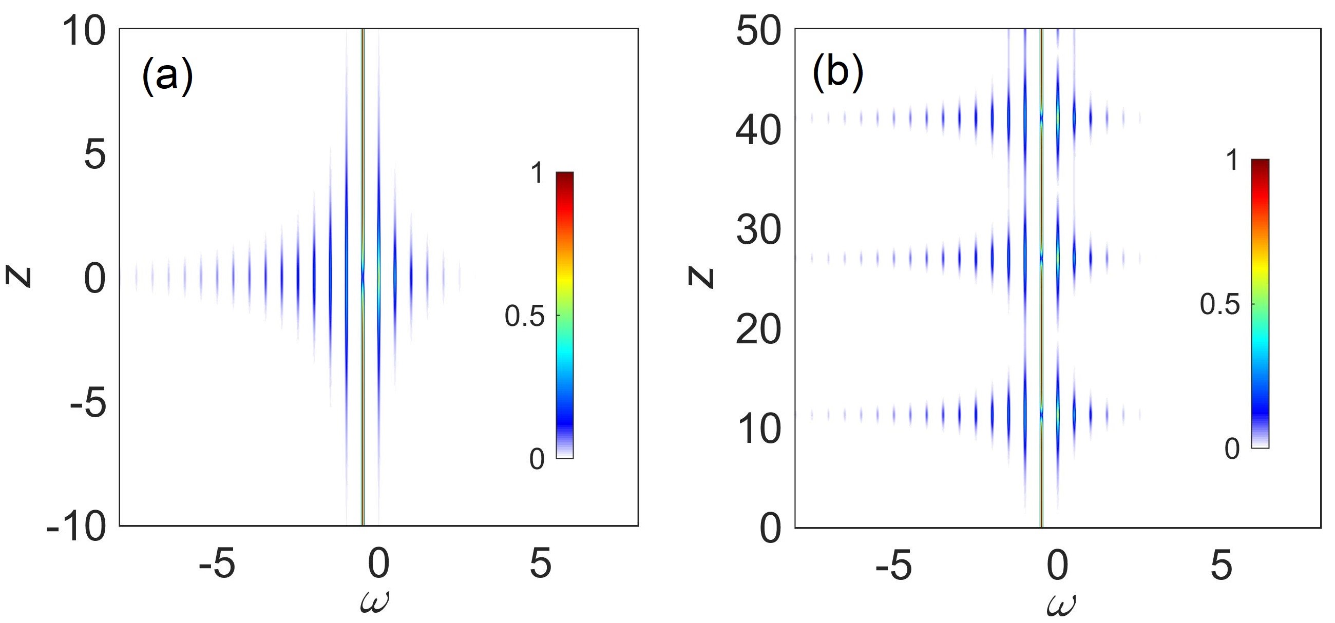 频域上非对称调制不稳定性的谱演化。(a)精确解析结果,(b)数值模拟