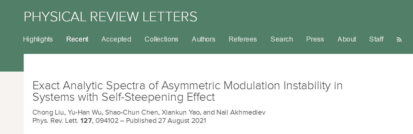 近日,乐鱼网页版页面登录理论物理团队成员刘冲副教授与合作者基于实验上可实现的可积模型,通过精确理论和数值模拟首次揭示了广泛存在的非对称调制不稳定性的严格物理图景,给出了精确描述该类不稳定性非线性演化性质和规律的基本方法,为实现观测提供了基准。研究成果以“Exact Analytic Spectra of Asymmetric Modulation Instability in Systems with Self-Steepening Effect”为题,于8月27日发表在物理学专业领域公认的顶级期刊Physical Review Letters上。这是以乐鱼网页版页面登录为第一单位在该期刊上发表的第三篇论文,是物理学学科建设的又一重大突破性成果。
