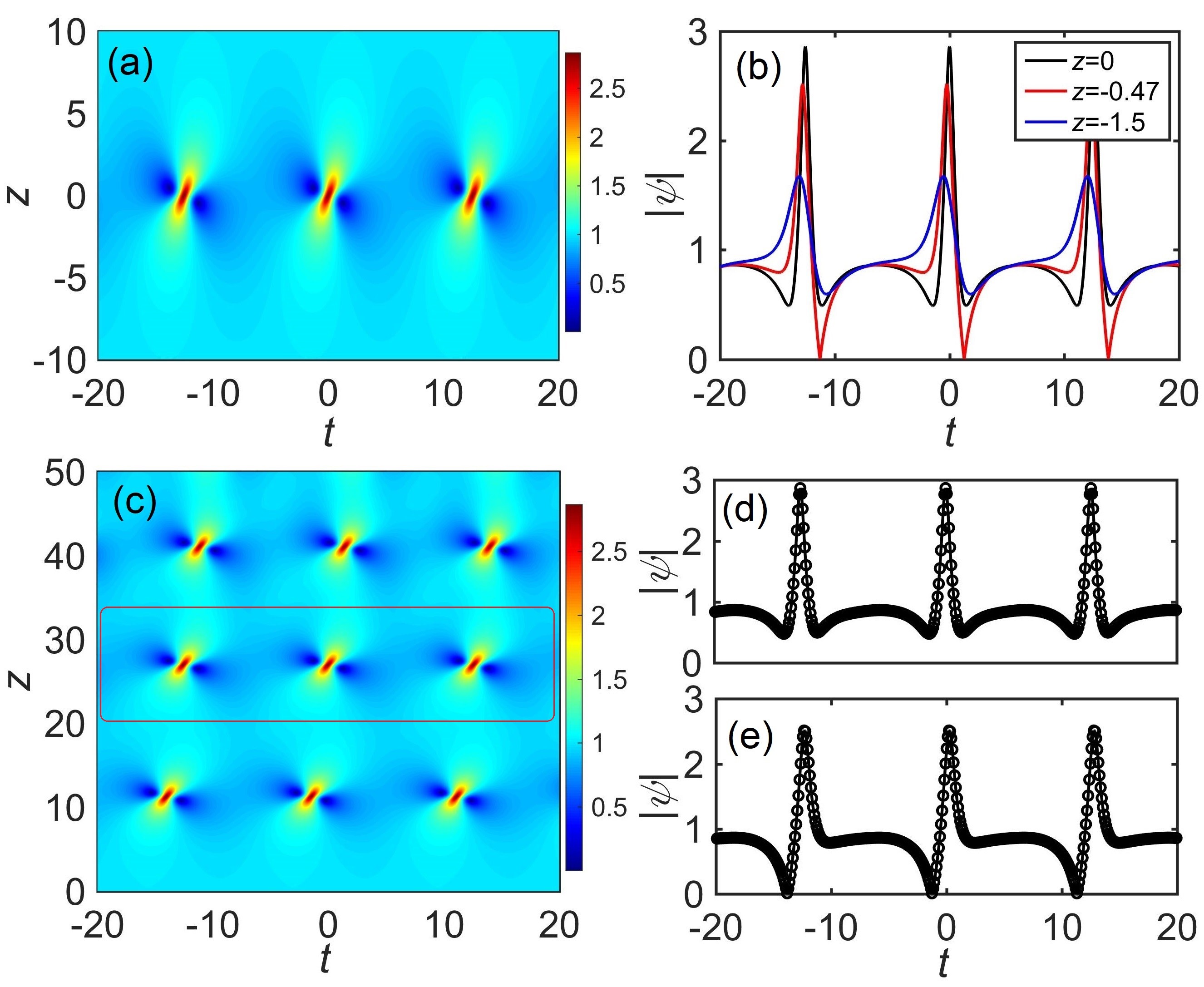 时域上非对称调制不稳定性的振幅分布。(a)(b)精确解析结果,(c)数值模拟。(d)(e)解析和数值结果对比。结果表明数值和解析结果完美吻合。