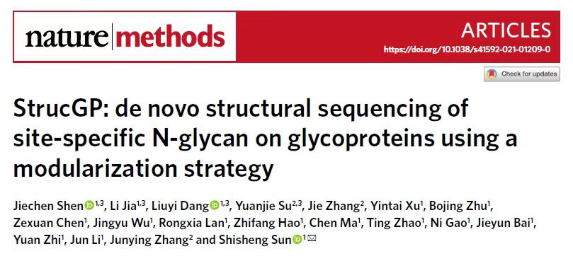8月2日,乐鱼网页版页面登录孙士生教授课题组与西安电子科技大学张军英教授课题组联合团队的重要研究成果在线发表在Nature Methods杂志上。成果以“StrucGP: de novo structural sequencing of site-specific N-glycan on glycoproteins using a modularization strategy”为题,介绍了一种可解析糖蛋白上糖链序列的新方法及其配套软件StrucGP,并描述了其技术细节。
