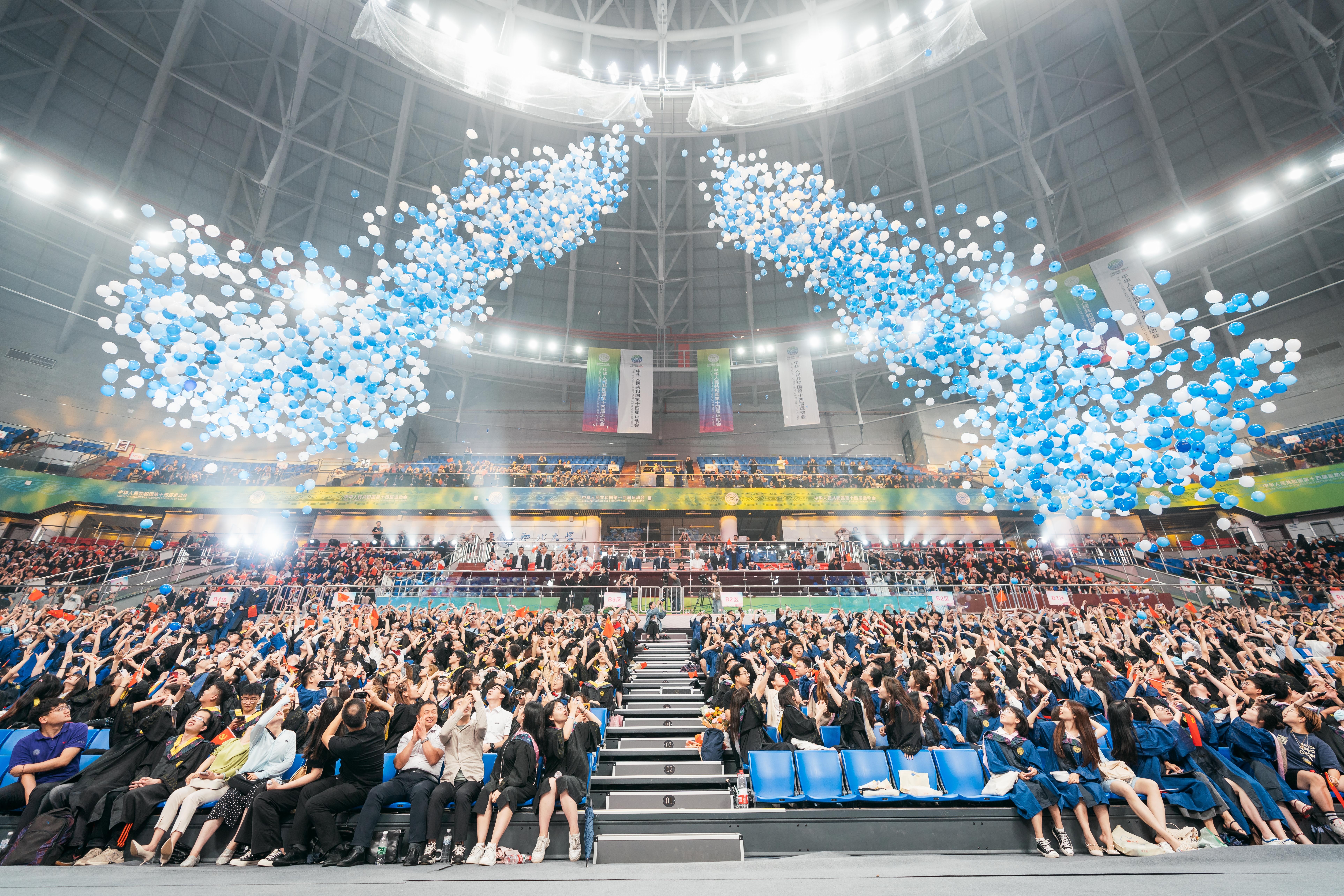 学生艺术团唯声合唱团用《匆匆那年》《告别时刻》《在灿烂的阳光下》等曲目将晚会推向高潮。最后,全场师生齐声高唱《乐鱼网页版页面登录校歌》,8000个蓝白相间的气球从天而降,这是学校送给2021届毕业生最浪漫的毕业礼物。