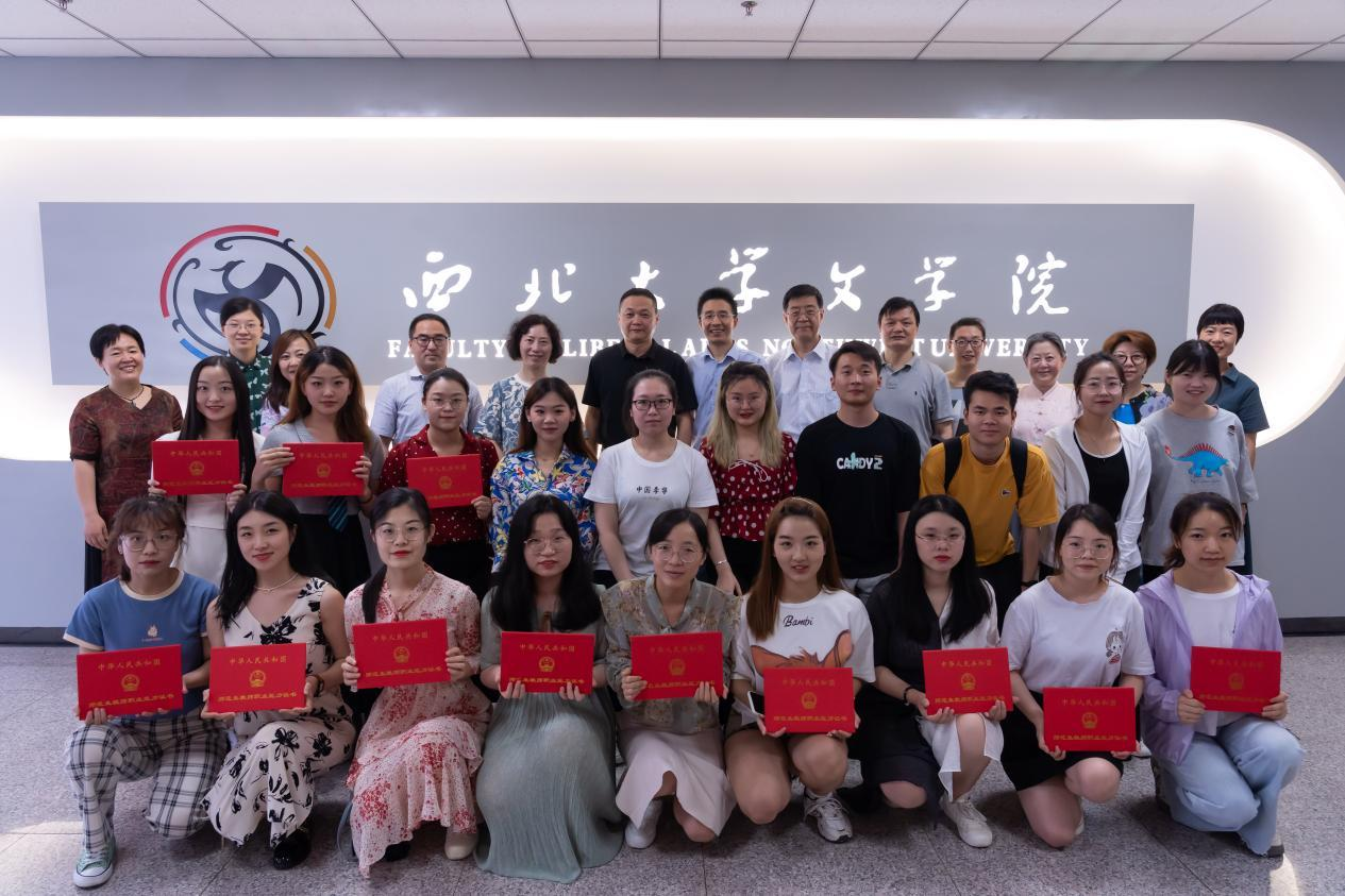 陈富林与文学院负责人共同为通过本次认定的硕士生颁发教师职业能力证书。