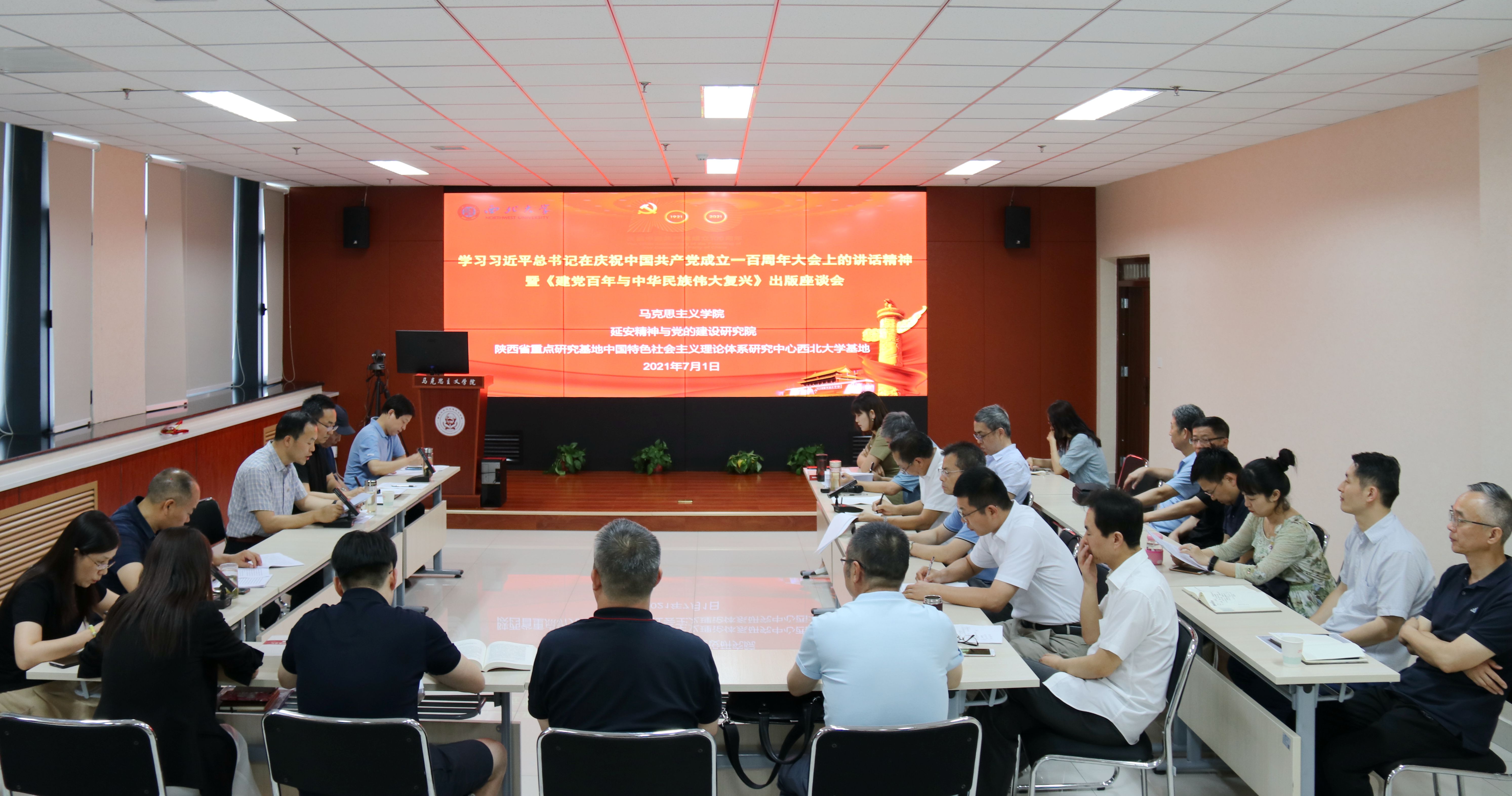 7月1日下午,马克思主义学院在长安校区召开学习习近平总书记在庆祝中国共产党成立100周年大会上的讲话精神暨《建党百年与中华民族伟大复兴》出版座谈会。马克思主义学院党政班子成员、思政课教师和学生代表参加座谈,会议由校党委副书记、马克思主义学院院长吕建荣主持。