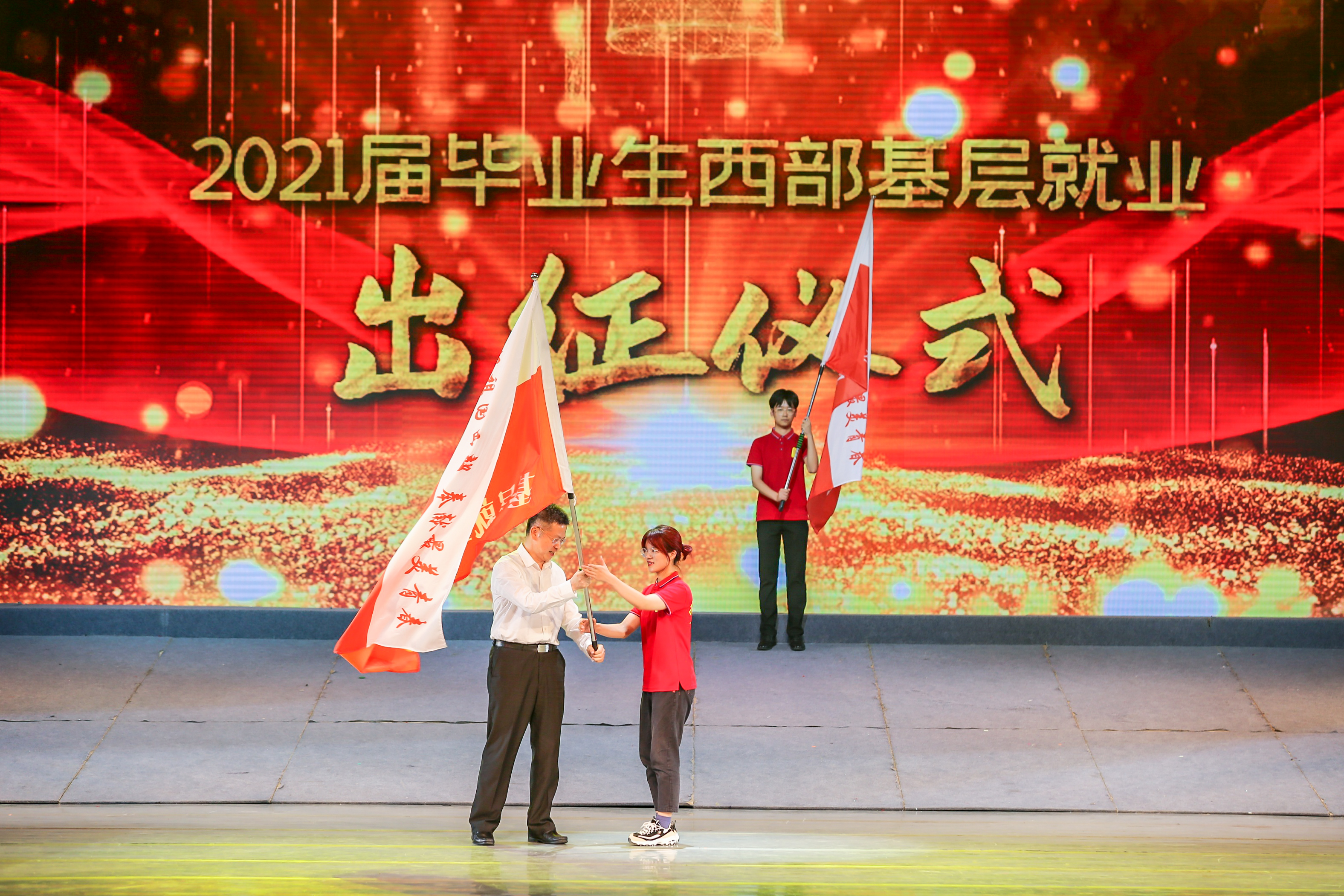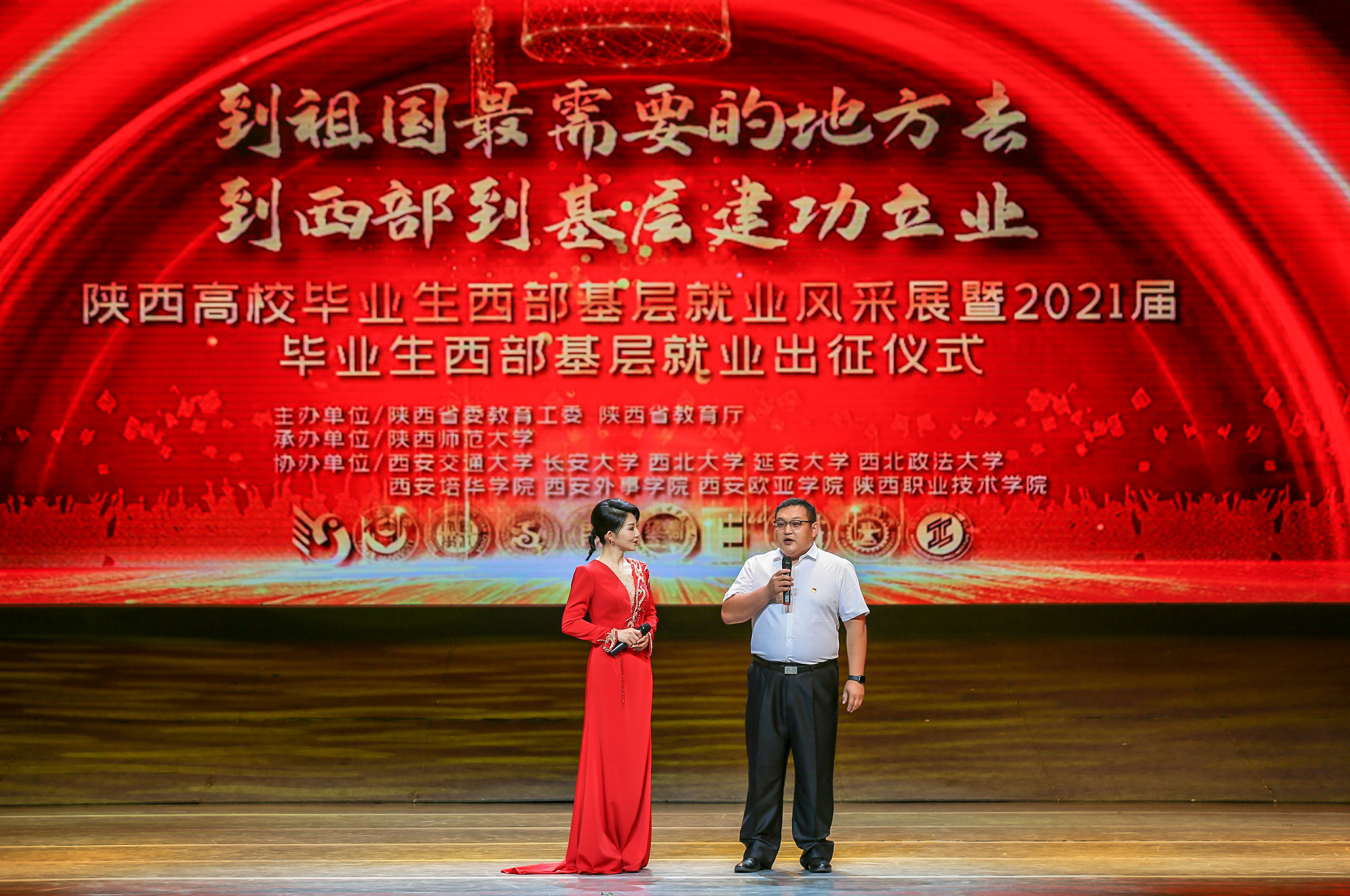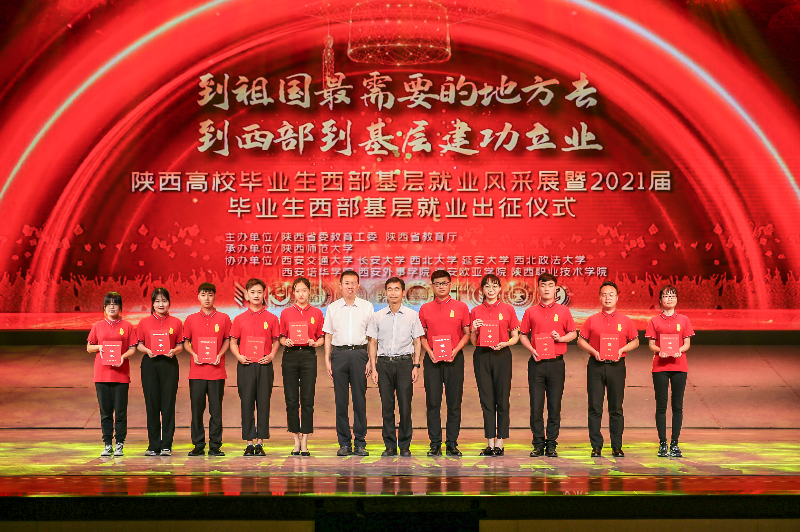 6月29日晚,由省教育工委、省教育厅主办的西部基层毕业生风采展暨2021届西部基层就业毕业生出征仪式在陕西师范大学举办。陕西省副省长方光华、省政府副秘书长张军林,教育部高校学生司毕业生就业处处长唐小平,省人力资源和社会保障厅副厅长井海滨,省委教育工委书记王建利,省教育厅厅长刘建林、副厅长高岭出席仪式。乐鱼网页版页面登录党委常委、副校长奚家米,就创中心主要负责人,2018届新疆选调生张祺及2021届部分西部基层就业毕业生代表参加了活动。