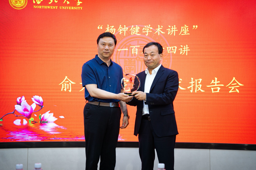 校党委常委、副校长赖绍聪向俞大鹏院士赠送“杨钟健学术讲座”纪念牌