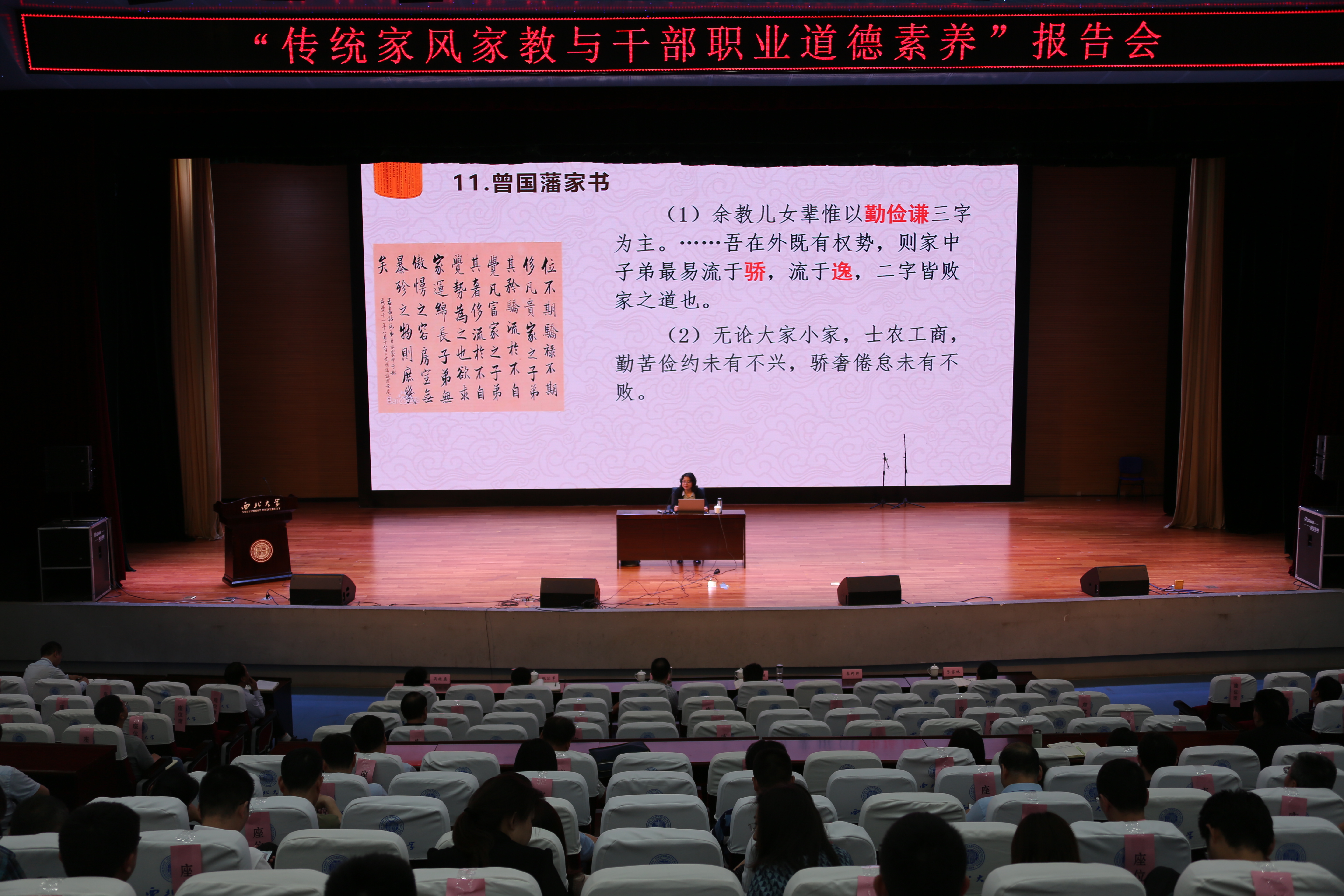 报告会上,张文利从四个方面详细阐述了家庭家教家风建设的重大意义和方法路径。她通过对中国古代传统家训家规的脉络梳理,探讨了古代家训家规的精神内核,寻绎了传统家训文化中的做人之道与为官之道,并为当代的干部培养和廉政建设提供了历史经验和借鉴。报告中,她引经据典,旁征博引,用专业的知识、通俗的语言将家风的重要意义和深远影响娓娓道来,深刻阐释了全面从严治党新形势下,传承并弘扬廉洁家风的时代价值。