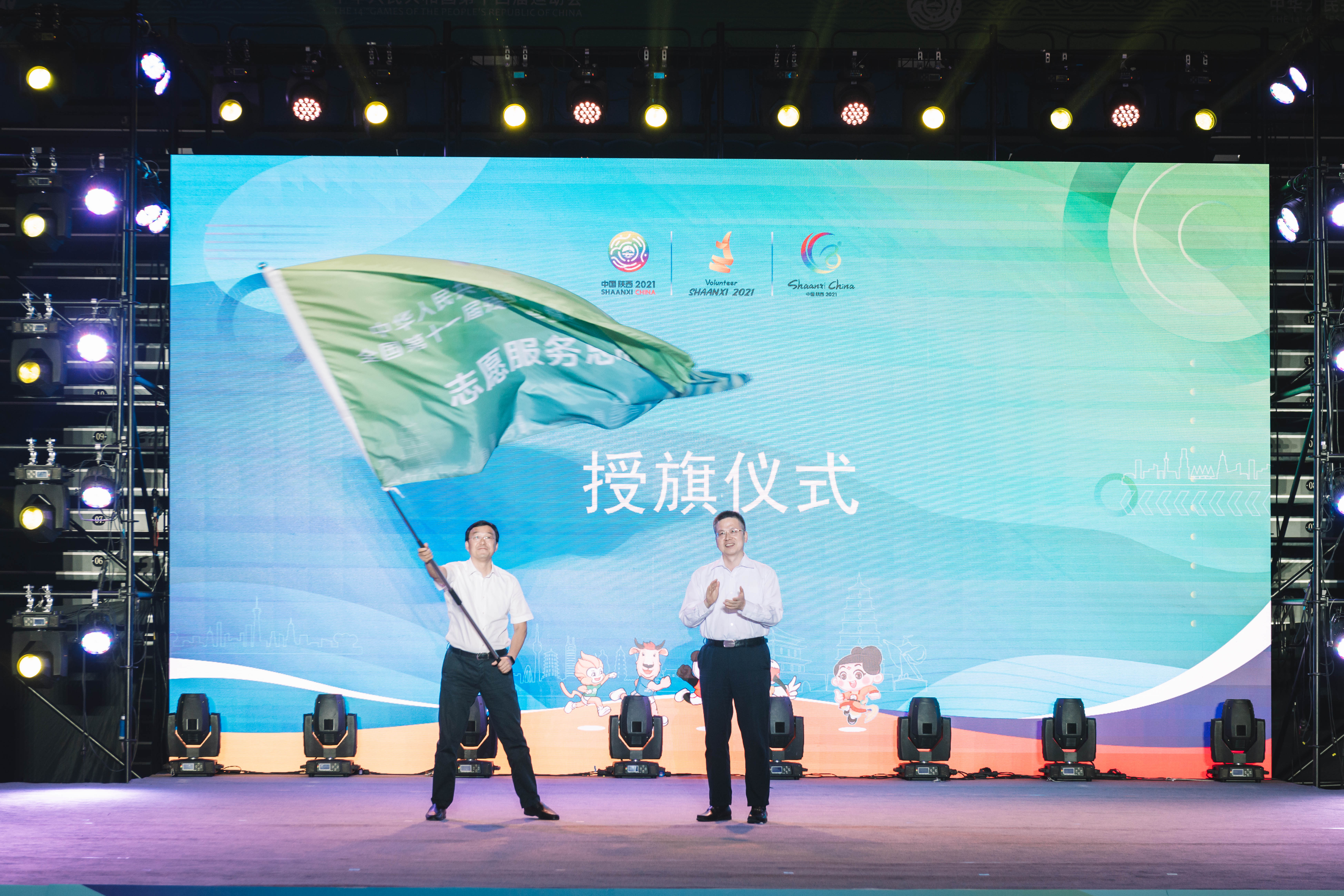 方光华为十四运会和残特奥会志愿服务总队授旗。与会领导为13个十四运会和残特奥会志愿服务支队授旗和13个十四运会和残特奥会志愿服务大队授旗。在段小龙的领誓下,420名与会志愿者宣誓。