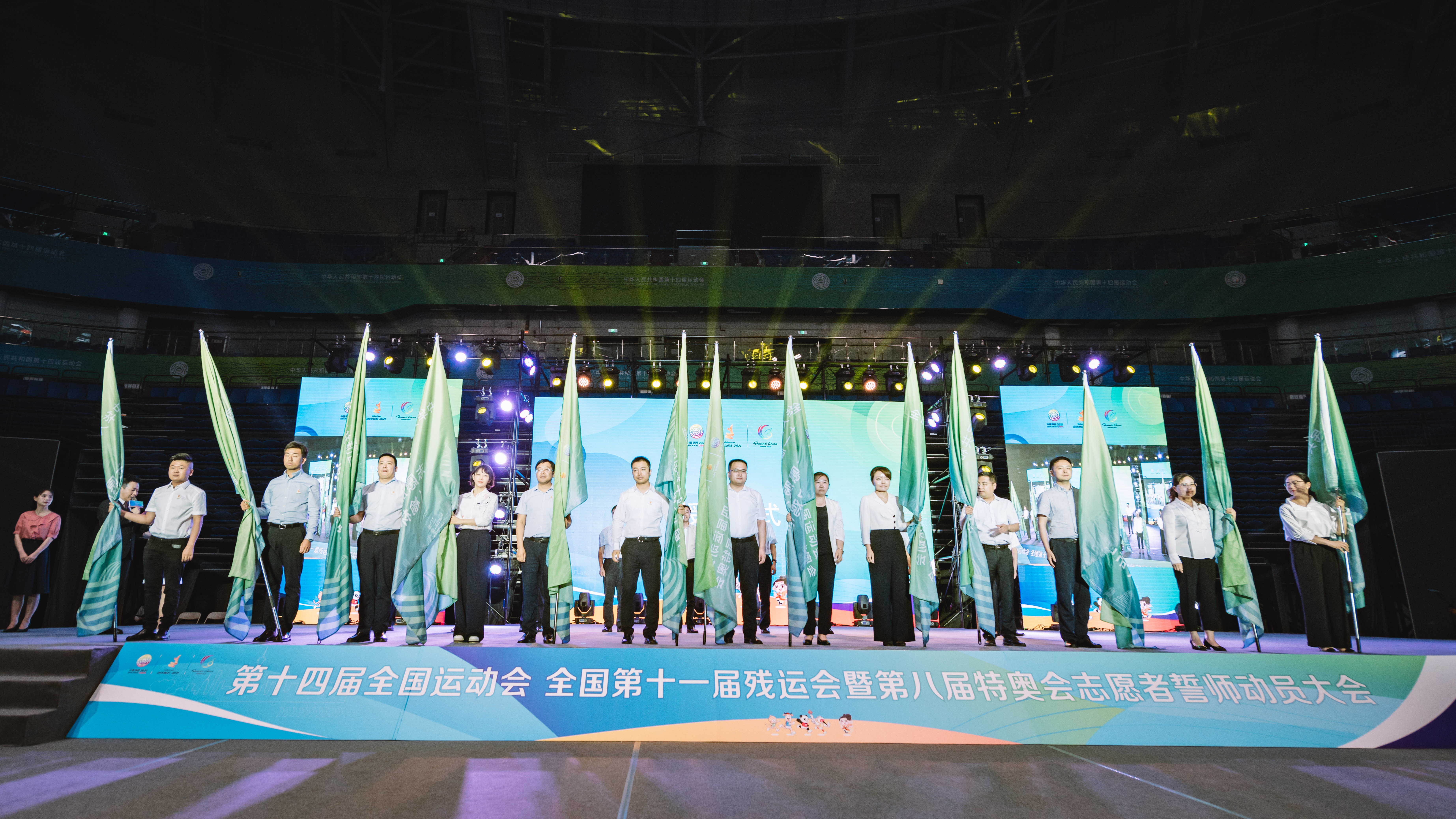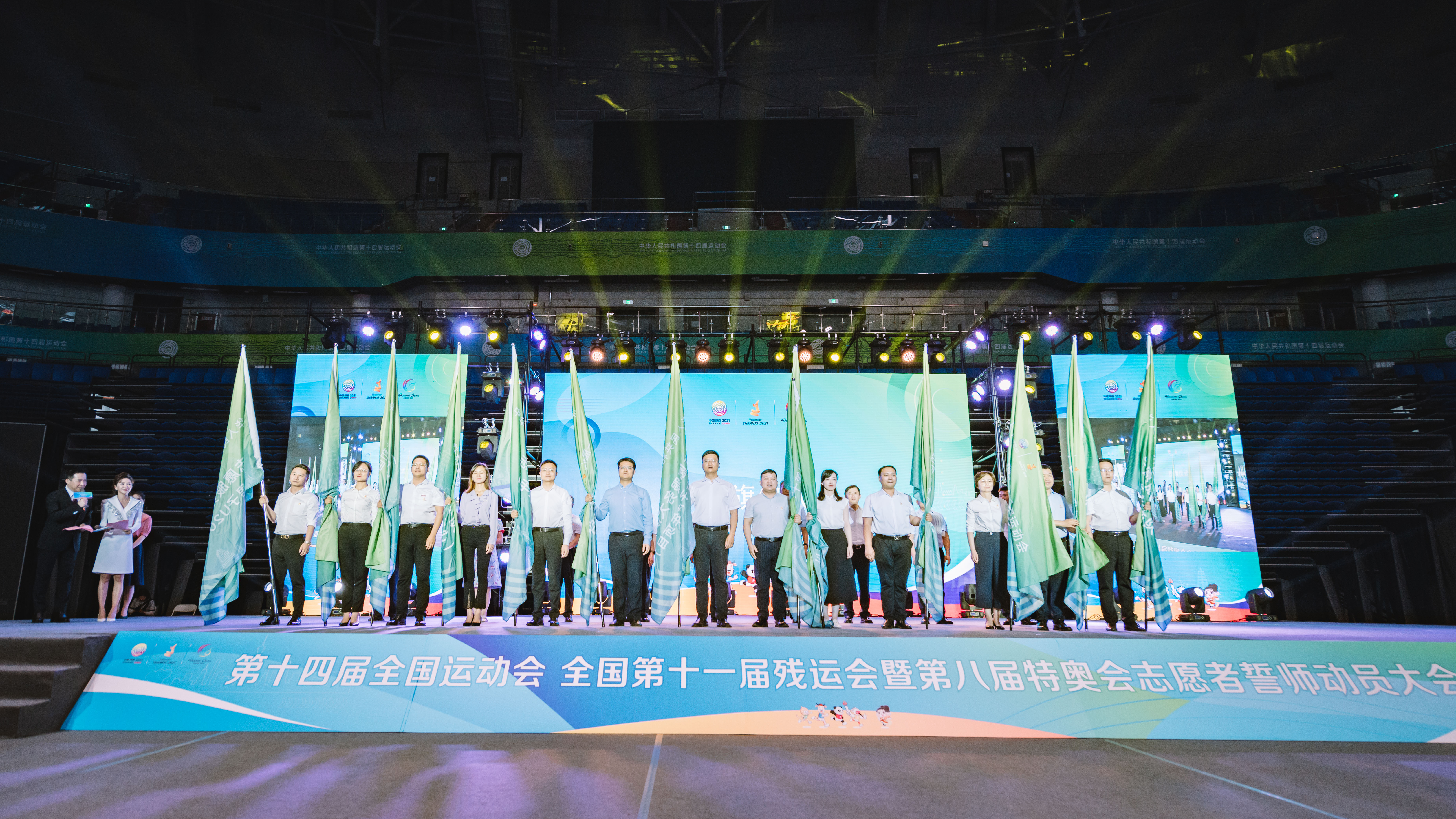 与会领导为13个十四运会和残特奥会志愿服务大队授旗