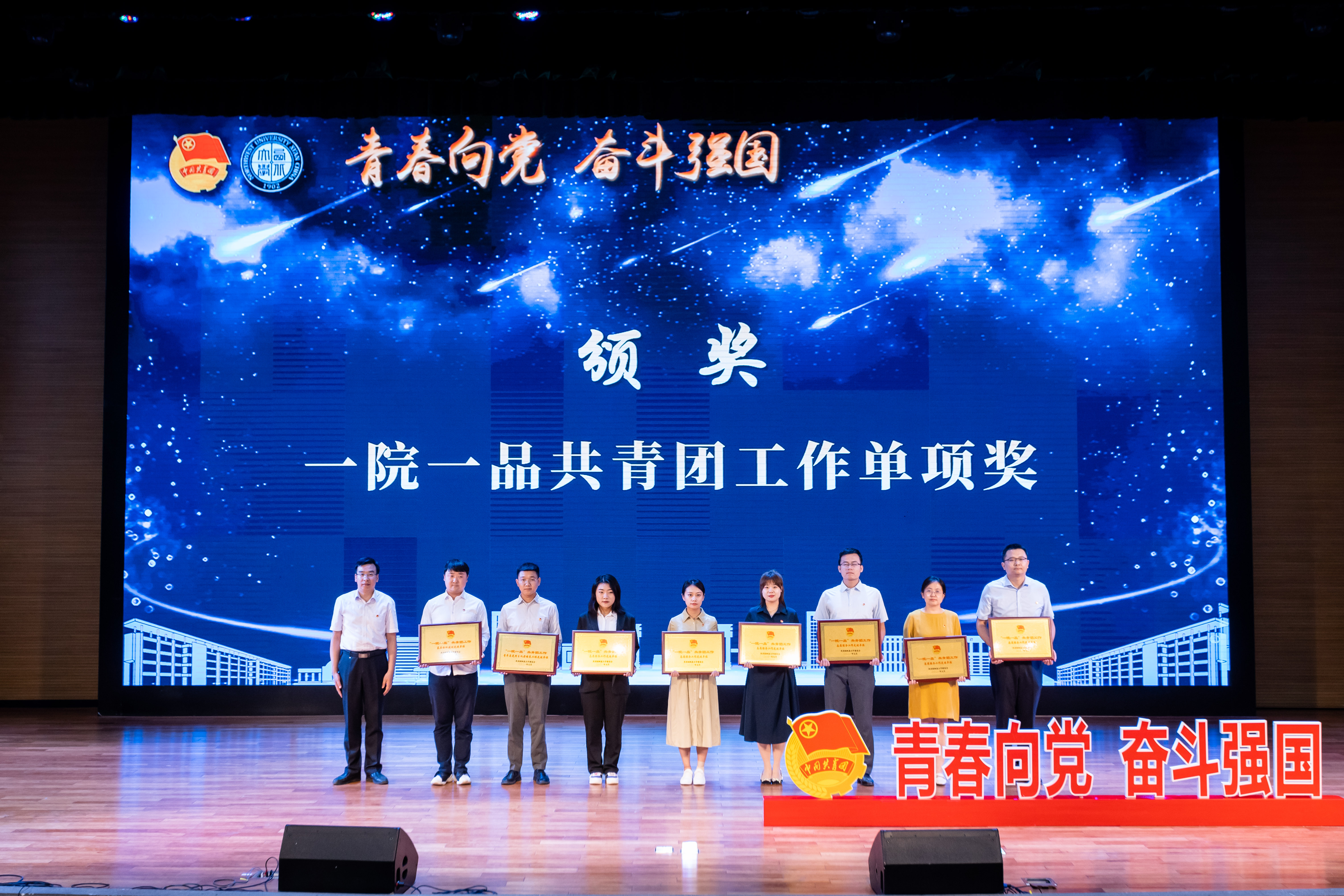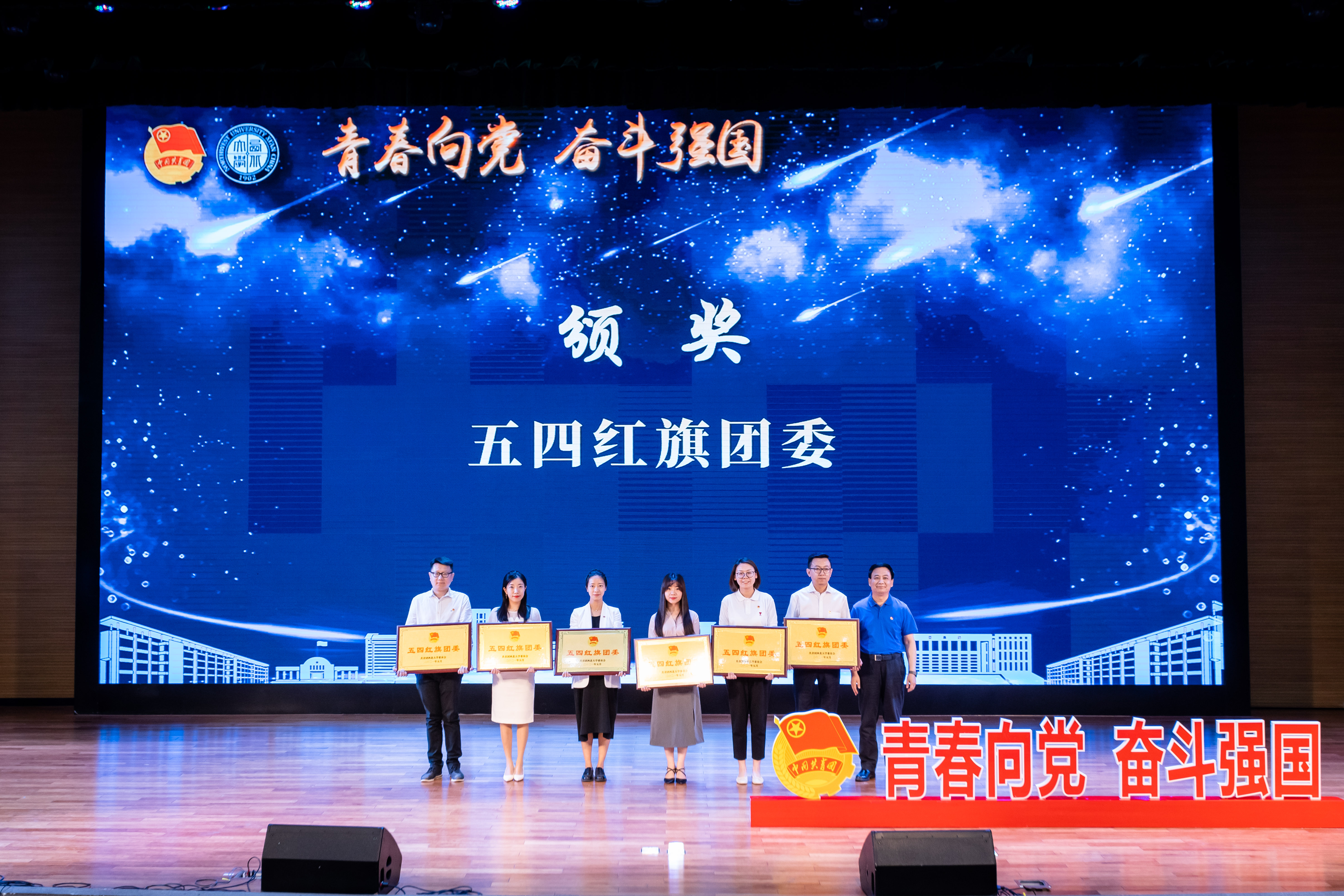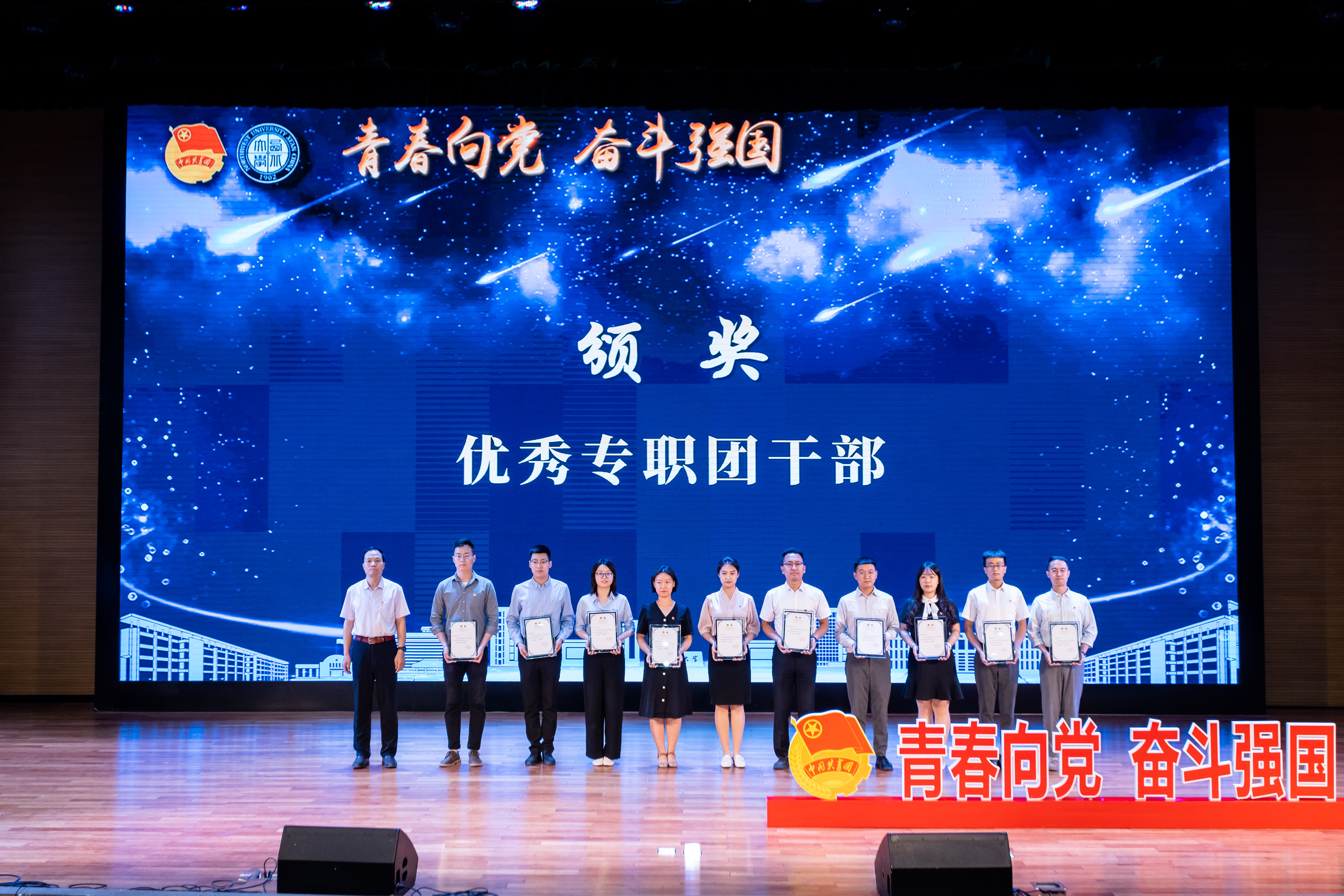 王亚杰为“五四红旗团委”颁奖、吕建荣为“优秀专职团干部”颁奖,赖绍聪和田明纲为“一院一品共青团工作单项奖”颁奖。今年的共青团特别贡献奖颁发给了全校兼职团干部,全校共有8名青年教师和73名学生加入兼职团干部的队伍,他们和专职团干部一起为学校共青团各项工作顺利开展贡献了力量。其他与会领导先后为优秀共青团员、优秀学生团干部、十佳团支部书记、五星级团支部、青年先锋队、“最西大”奖的获奖集体和个人颁发奖牌和证书。