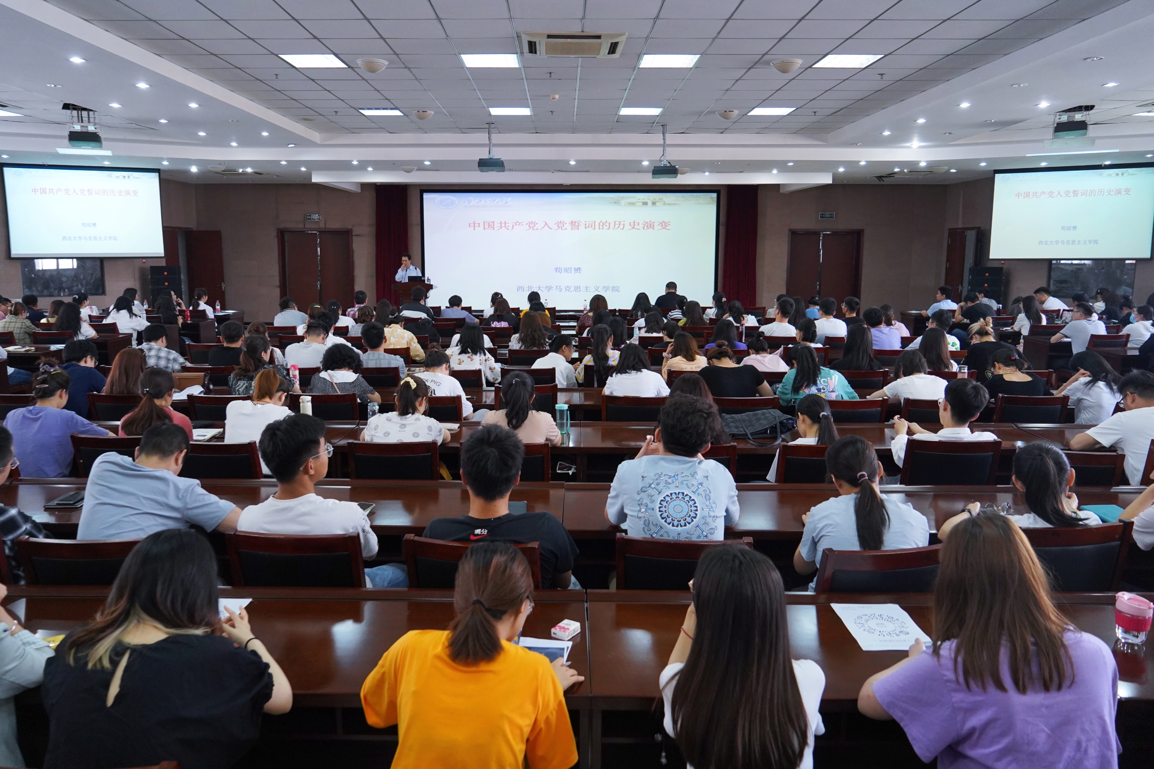 开班仪式后,马克思主义学院苟昭赟副教授为培训班学员作了题为“中国共产党入党誓词的历史演变”的报告,他详细解读了入党誓词在中国共产党成立后五个历史时期的不同表达及在各时期体现出的核心意蕴,讲述了中国共产党奋斗历程。随后,苟昭赟倡议全体学员应“让初心和本心成为历史自觉”,期望“在凝望历史中拥有历史自觉,历史自觉带来前行澄明之瞳,澄明之瞳启和创造大美历程”。