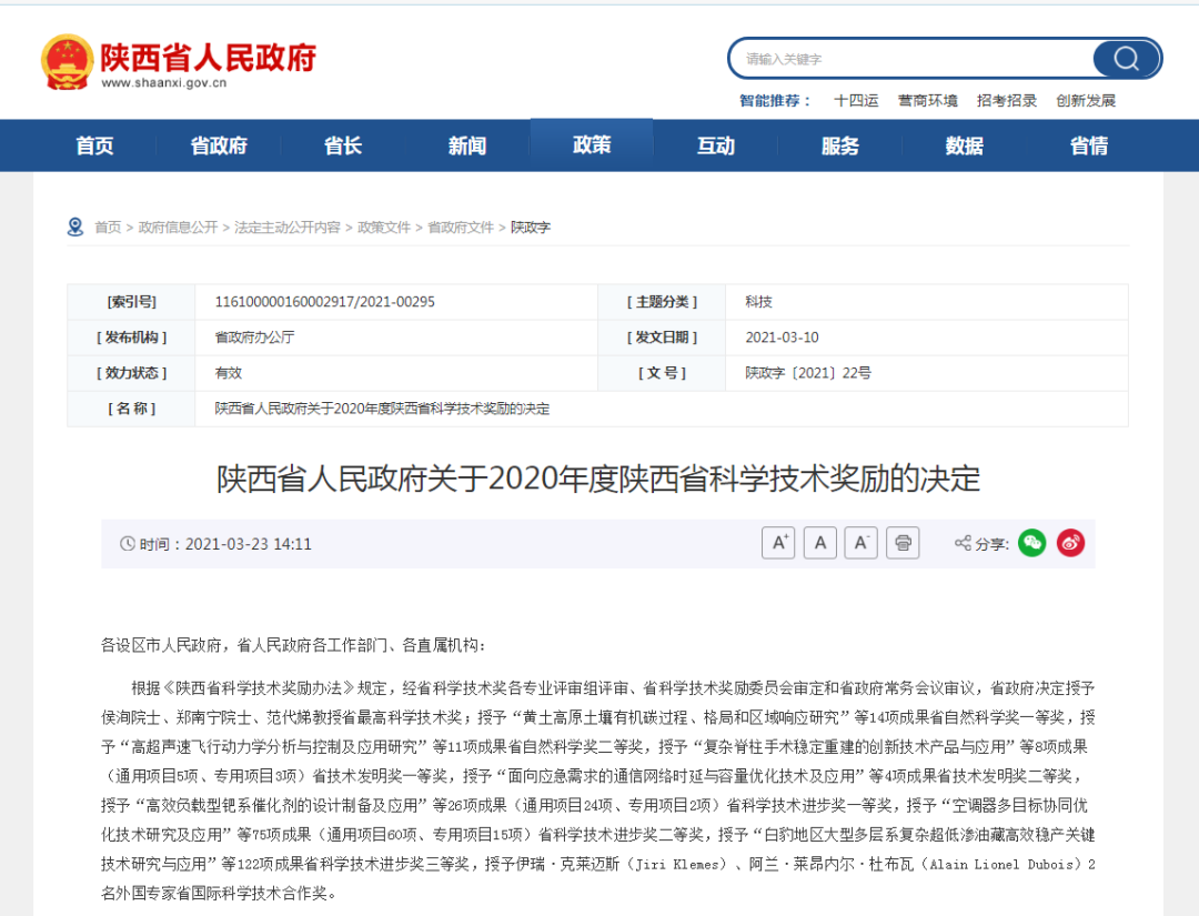 3月23日,《陕西省人民政府关于2020年度陕西省科学技术奖励的决定》发布。乐鱼网页版页面登录化工学院范代娣教授,乐鱼网页版页面登录杰出校友、中国科学院西安光学精密机械研究所侯洵院士等三人荣获陕西省最高科学技术奖。