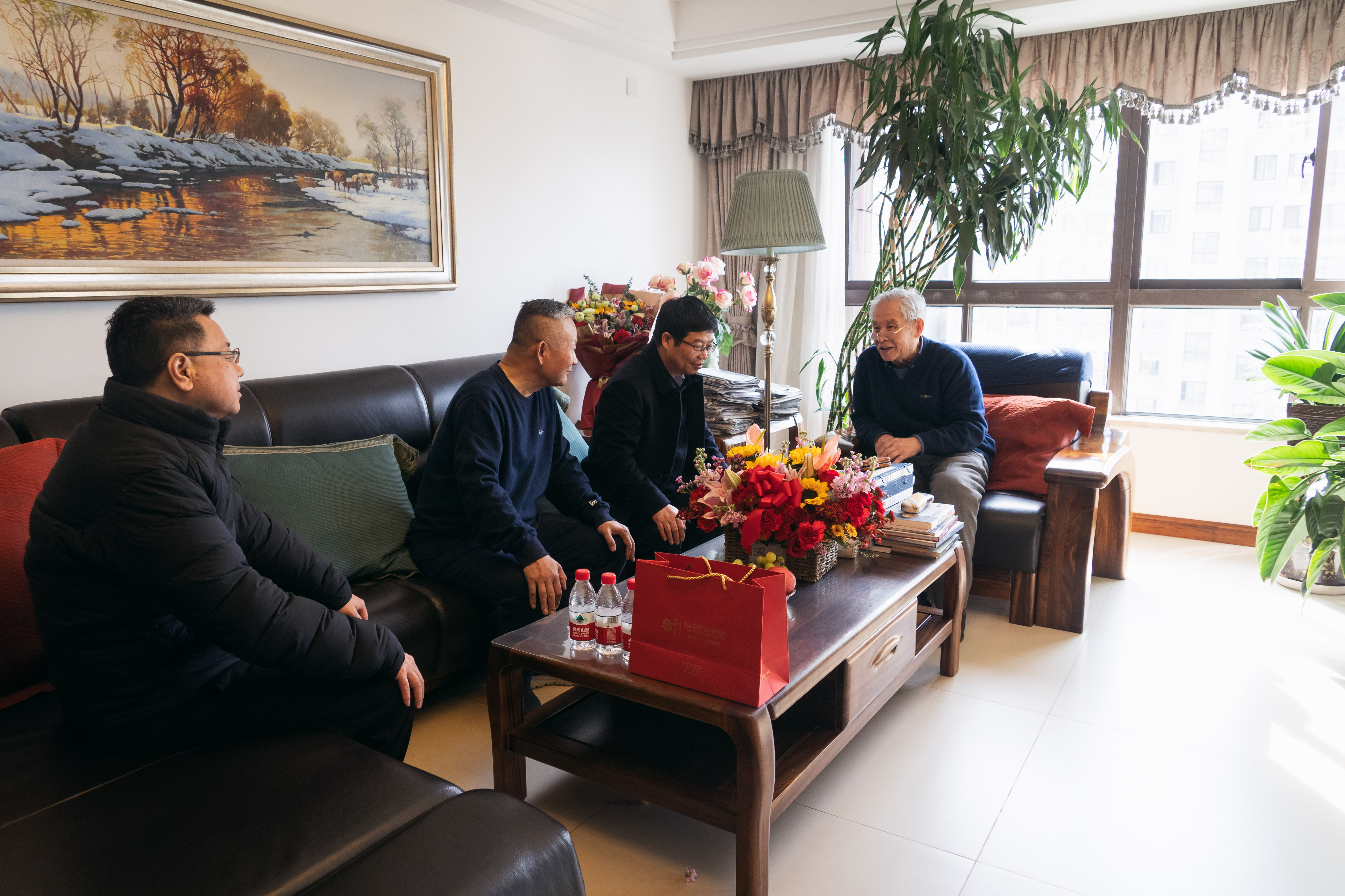 梁桂代表省委、省政府向张国伟、舒德干送上鲜花和慰问金。在交谈中,梁桂详细询问了两位院士的身体状况和工作情况,向两位院士介绍了陕西在统筹疫情防控和经济社会发展、深化供给侧结构性改革等方面取得的新进展,希望他们继续为陕西构建新发展格局和推动经济社会高质量发展贡献更多智慧和力量。张国伟、舒德干感谢省委、省政府的关心关怀,表示将在人才培养、科学研究、社会服务等方面继续发挥好“传帮带”作用,为陕西新时代追赶超越献计献策。郭立宏代表学校感谢省委、省政府对学校事业发展的关心支持,表示学校将持续为专家人才营造良好发展环境,充分发挥高层次人才和高水平团队引领支撑作用,助力陕西高质量发展和“十四五”良好开局。
