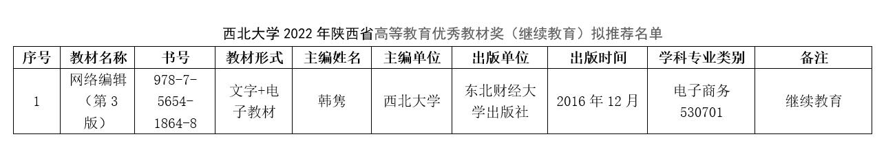 根据陕西省教育厅《关于开展陕西省2022年职业教育和高等教育优秀教材奖评选工作的通知》(陕教材办〔2022〕12 号)要求,乐鱼网页版页面登录组织开展了乐鱼网页版页面登录2022年陕西高等教育优秀教材奖(继续教育)评选推荐工作,经个人申报、院系推荐、专家评议,拟推荐《网络编辑》教材参加陕西省高等教育优秀教材奖(继续教育)评选。现将拟推荐名单公示如下,公示期为6月7日至6月11日。公示期间如有异议,请以实名书面形式反映。