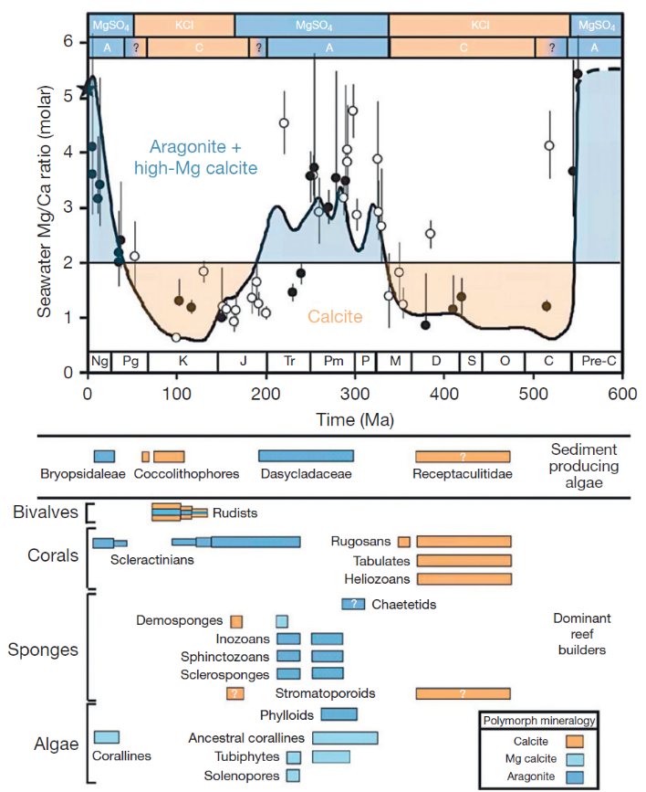 图1:显生宙海水镁钙比周期性演化。Mg/Ca>2为“文石海”,Mg/Ca<2为“方解石海”(据Lowenstein et al., 2014)