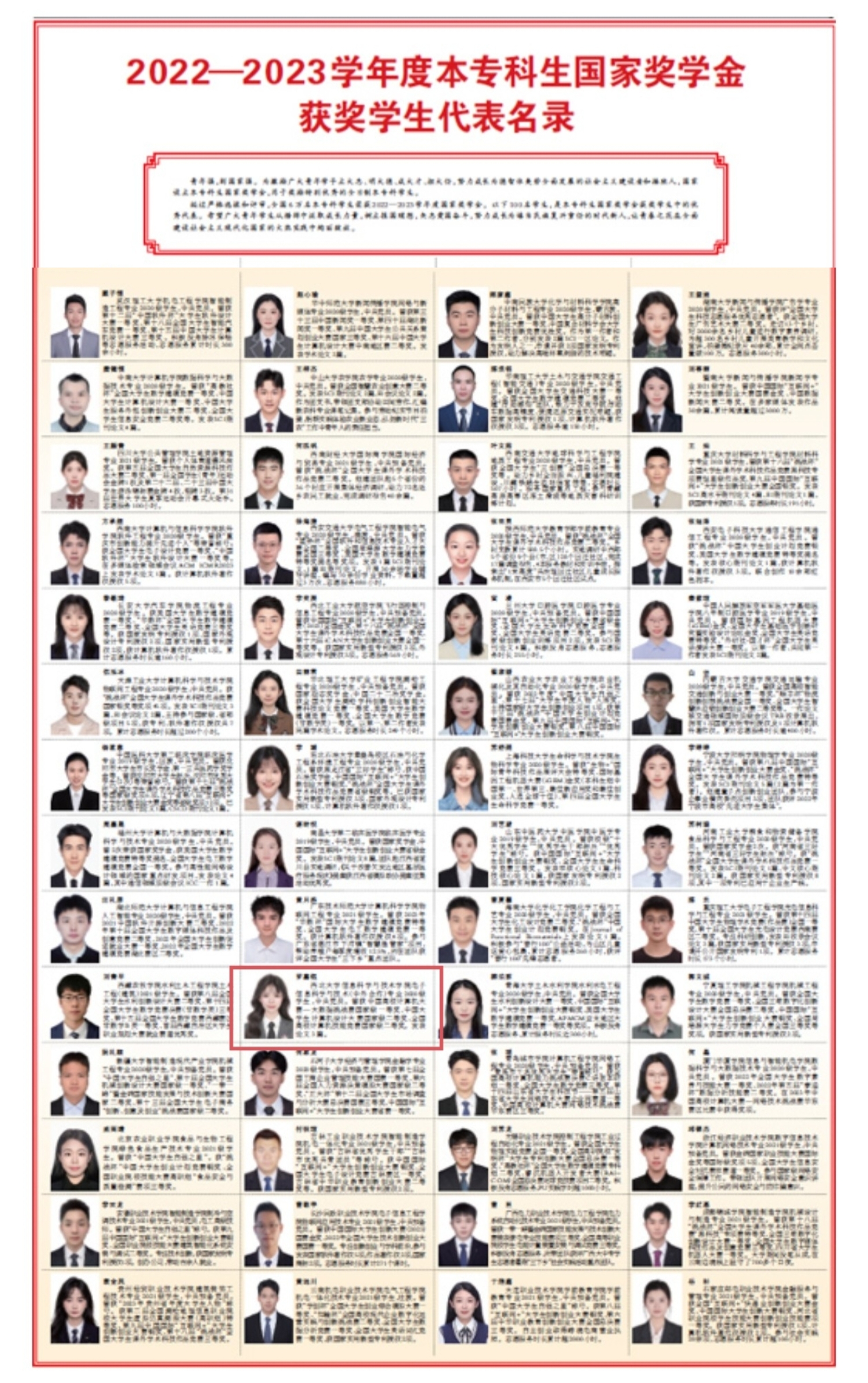 在国家奖学金评定过程中,学校严格评选条件,积极优化评审程序,深入挖掘国家奖学金的导向作用和激励功能。2023年,经过学生自主申请、班级民主评议、院系推荐和学校审核等环节,最终有49名优秀学子荣获本科生国家奖学金。