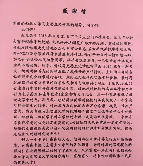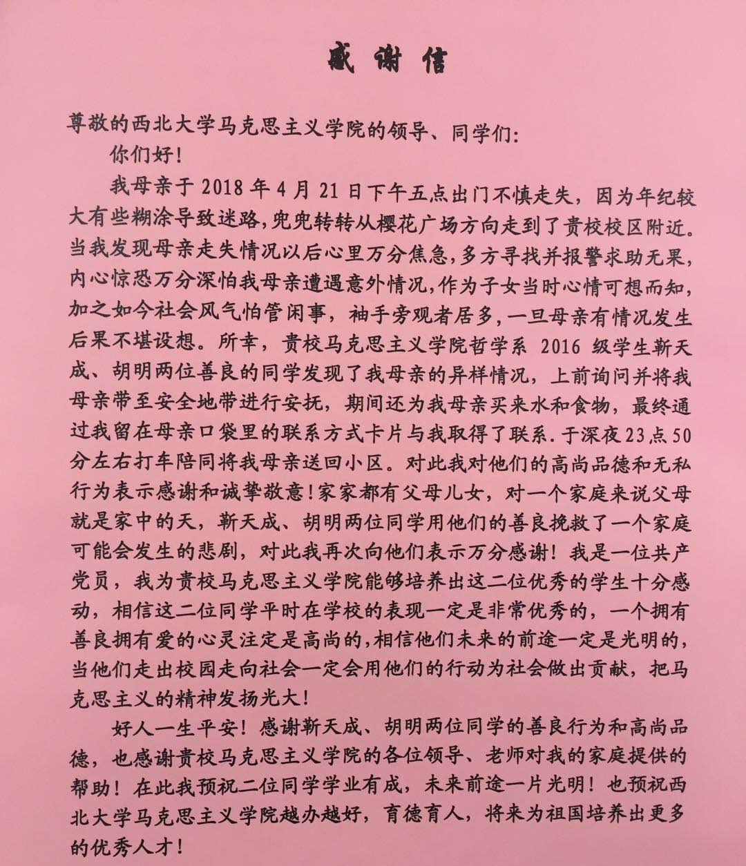 5月1日,家住长安区的张先生专程为乐鱼网页版页面登录马克思主义学院送来感谢信,对2016级哲学专业本科生靳天成、胡明两位同学护送其母亲回家的善举表示感谢。