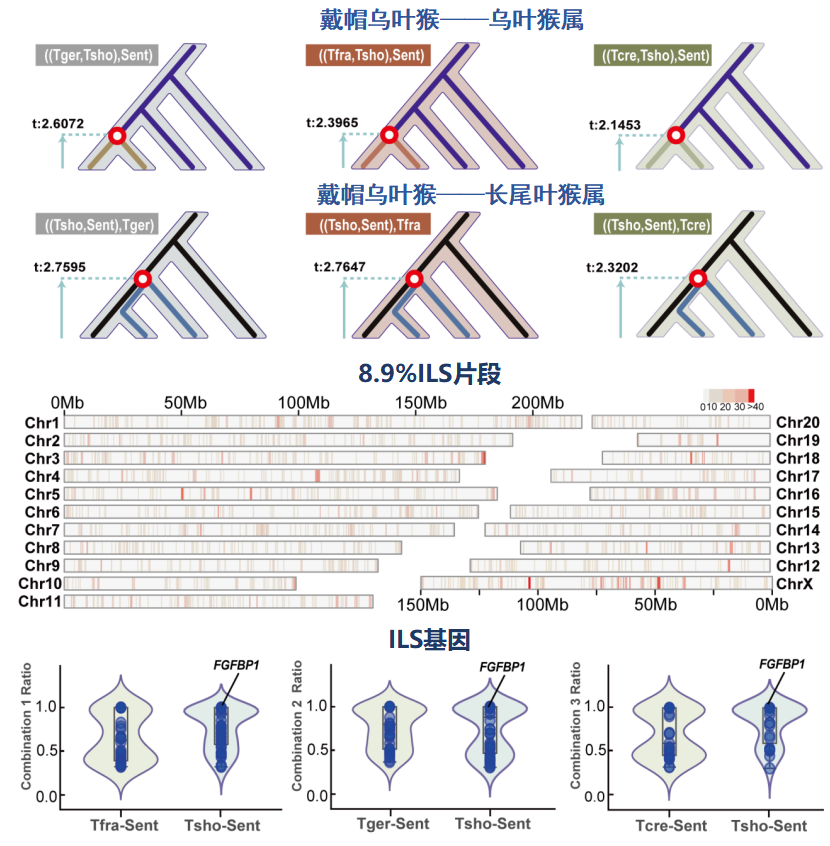 全基因组分析显示,戴帽乌叶猴基因组中约有8.9%的区域仍保留着不完全谱系分选的痕迹。“这就像‘基因抽签’游戏,”齐晓光形象地比喻,“在物种快速分化初期,祖先种群的基因,被随机分配给了不同后代支系。戴帽乌叶猴和长尾叶猴虽然分家了,却凑巧都继承了让体型变大的同一套古老基因。”