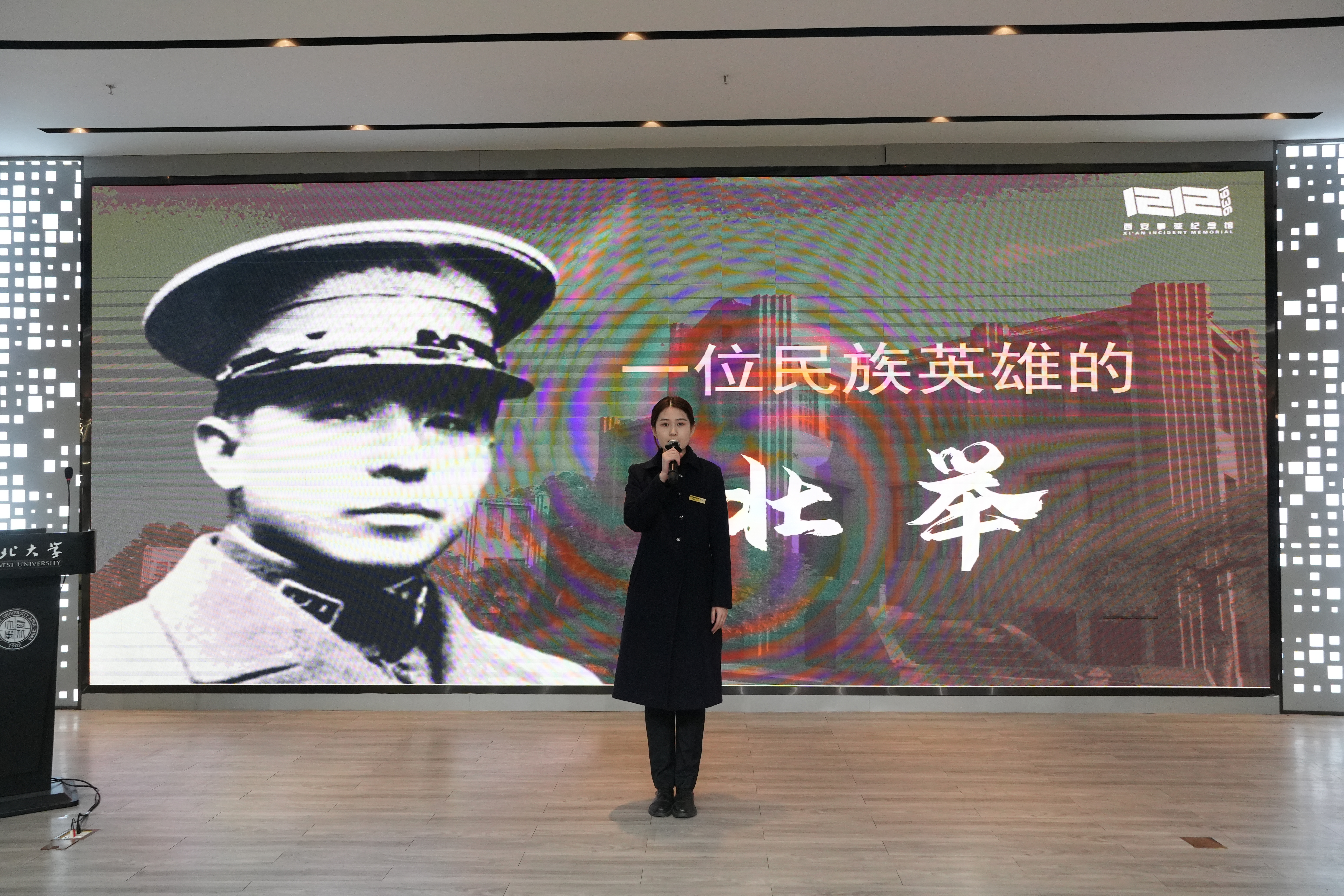 主旨宣讲环节,西安事变纪念馆讲解员李娜、李昱颉、张文洁、刘雨晴分别以《珍贵的毛毯永恒的见证》《军装铸英魂》《一位民族英雄的壮举》《一条不同寻常的皮带》为题,以馆藏文物为线索,生动讲述了文物背后的抗战故事,带领现场师生重温那段烽火岁月。