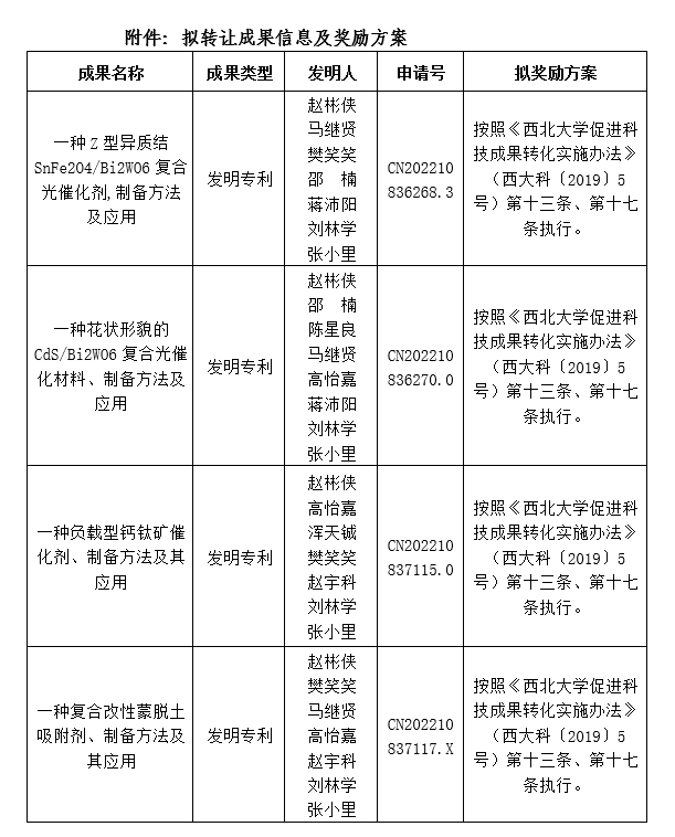 按照《乐鱼网页版页面登录促进科技成果转化实施办法》(西大科〔2019〕5号)相关规定,拟对乐鱼网页版页面登录化工学院赵彬侠教授作为成果负责人的4项专利申请权实施转化,现将相关信息公示如下: