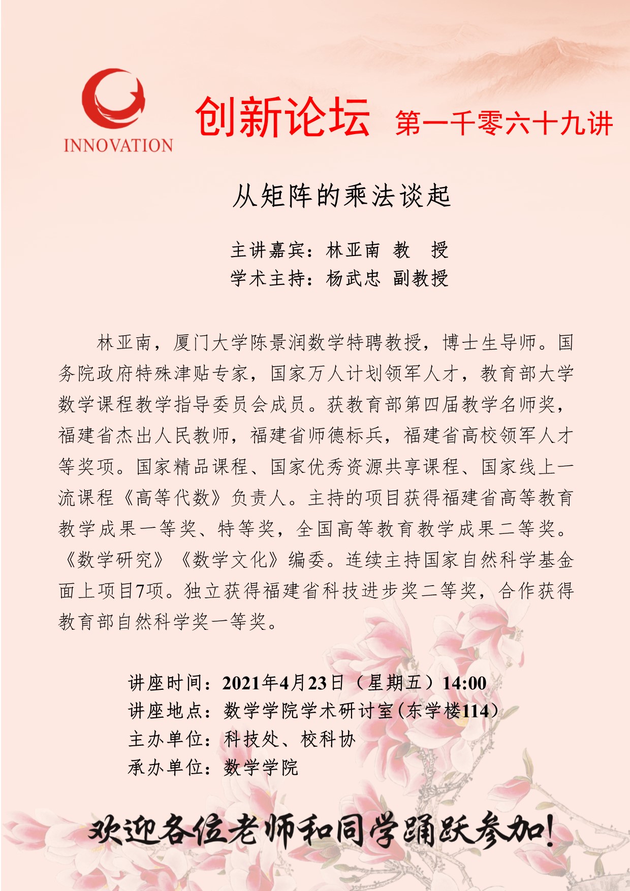 林亚南 教授 乐鱼网页版页面登录创新论坛第一千零六十九讲:从矩阵的乘法谈起 讲座时间 2021年4月23日(星期五)14:00 讲座地点 数学学院学术研讨室(东学楼114) 讲座人介绍 林亚南 教授 讲座内容