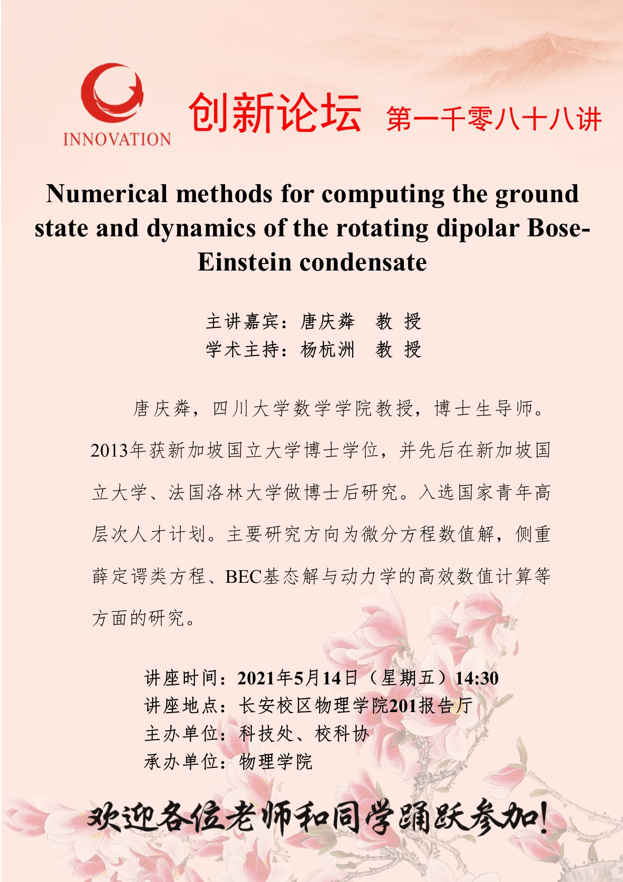 唐庆粦 教 授 乐鱼网页版页面登录创新论坛第一千零八十八讲:Numerical methods for computing the ground state and dynamics of the rotating dipolar Bose-Einstein condensate 讲座时间 2021年5月14日(星期五)14:30 讲座地点 长安校区物理学院201报告厅 讲座人介绍 唐庆粦 教 授 讲座内容